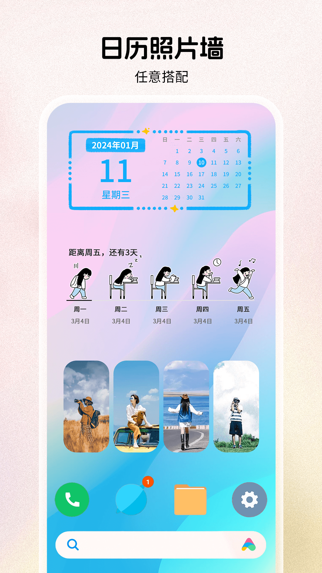 完美适配安卓系统,拥有数十种类型风格,为手机桌面增添无限趣味。可自由组合搭配,定制专属于自己的个性化手机桌面。