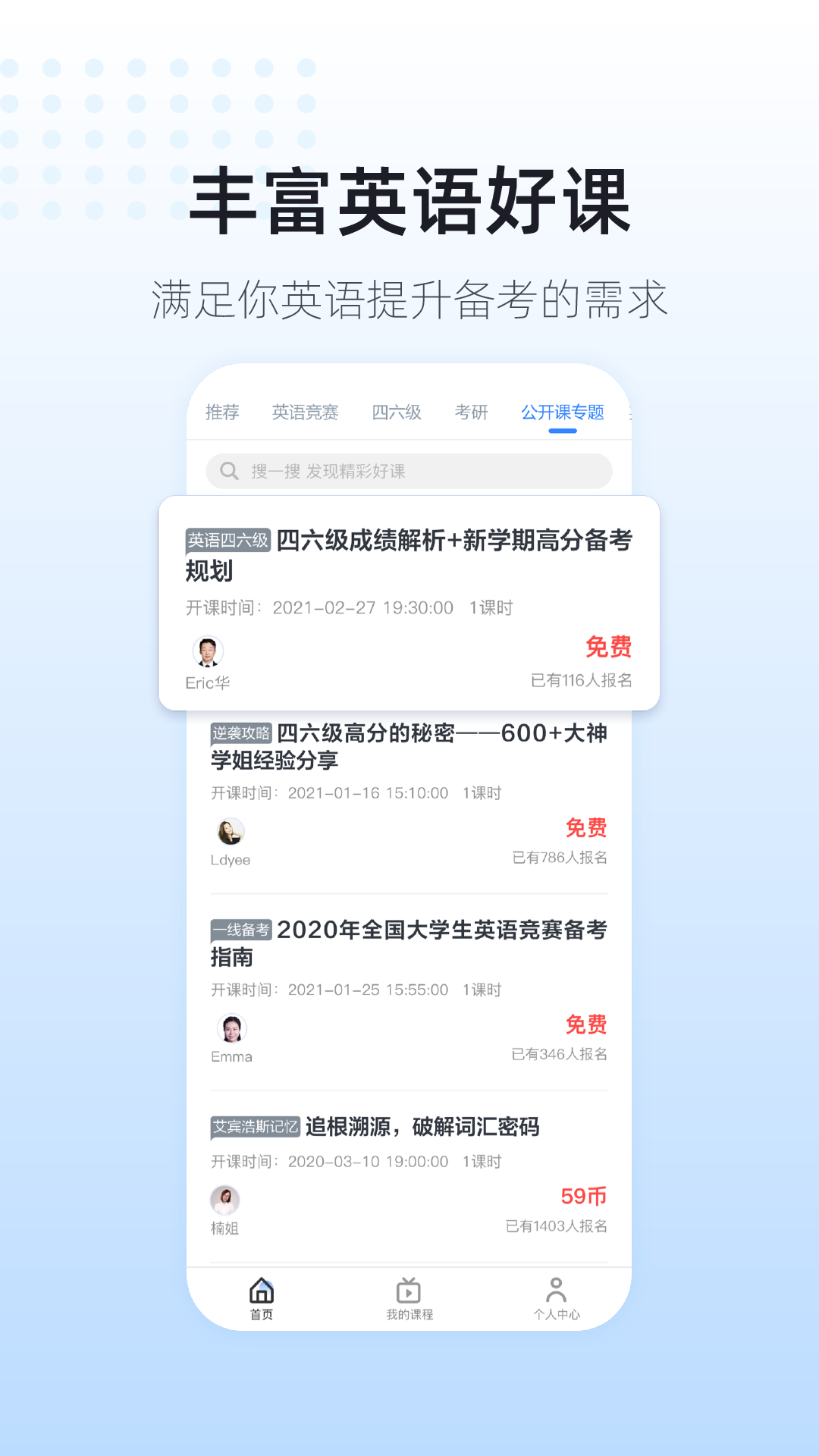英伽的课程产品包含全国大学生英语竞赛、英语四六级、考研、出国留学、实用英语以及法、德、日等小语种相关内容,能够为用户提供直播课程、精品录播课程、教辅资料、题库等一整套的备考服务。