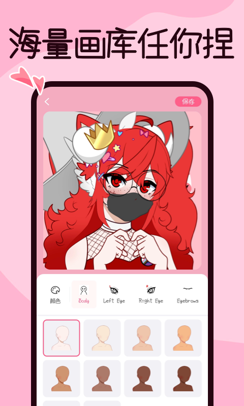 捏脸是一款充满个性化的二次元头像创作软件。在这个应用当中,为用户内置了数百套捏脸模板以供选择。而且,这里还有各种各样的元素,像是发型、眼睛、肤色、配饰等都能随心挑选。你既能够运用画手们所提供的模组,按照自己的想法自由地组装各种配件,也可以选择随机生成样式,其自由度达到了极致,能够轻松地帮你创作出心中理想的男神或者女神形象!