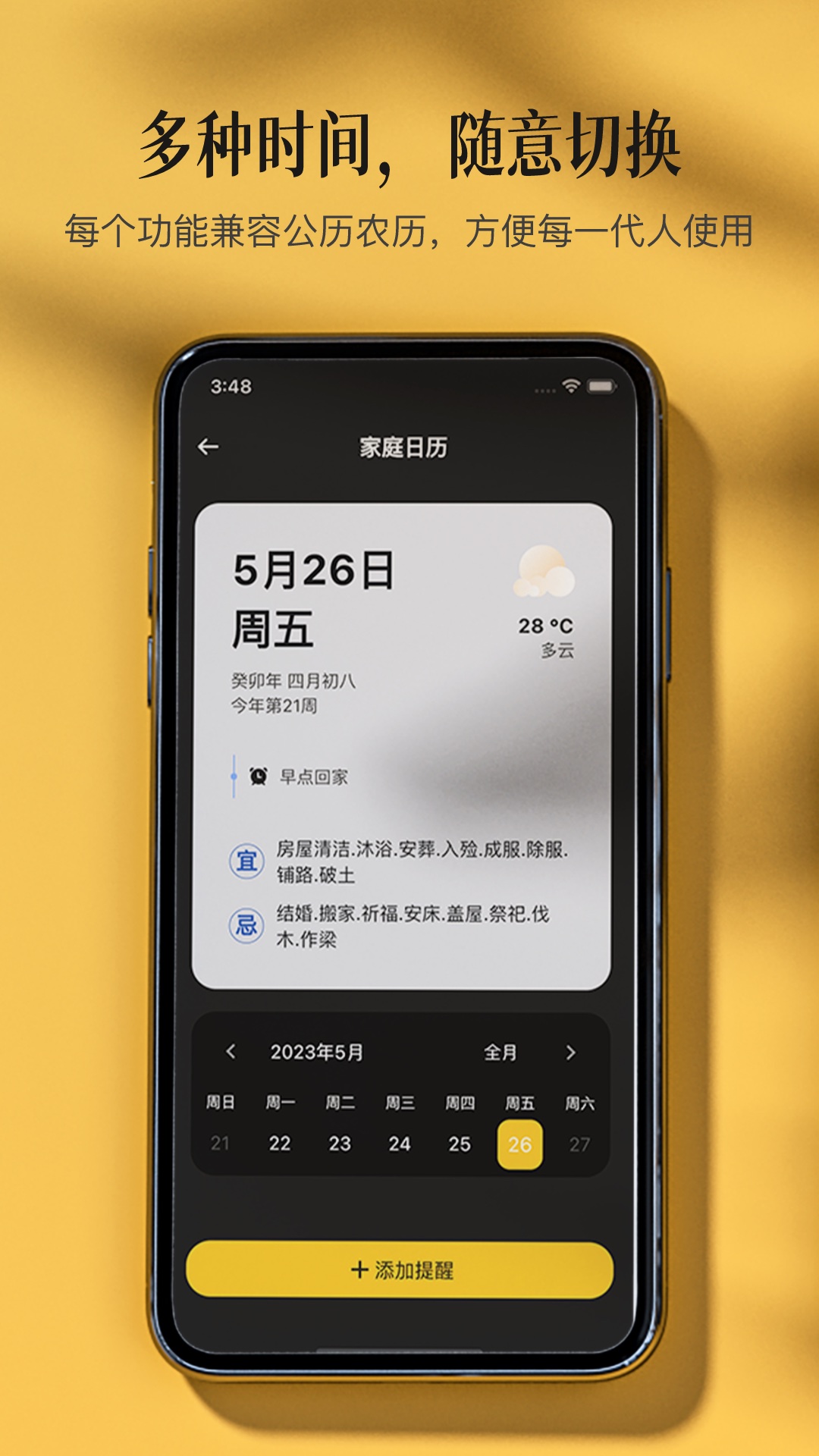 - 家庭提醒与纪念日添加功能:此功能还支持便捷的农历转换,让您不会错过每一个重要的日子。