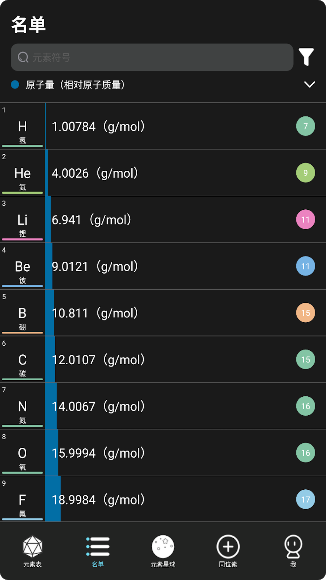 能够查看元素周期表内任意元素将近百个参数。可以运用多种规则对元素进行筛选,并且能在列表中突出显示筛选出的元素。提供数十种类型的条件搜索方式,例如通过缩写、中英文名称、原子量等类型来搜索元素。还提供元素的全屏高清图片以及更多同位素属性。