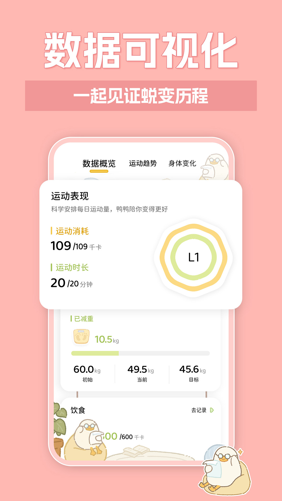 ●身材曲线变化。数据页面记录了你的身材变化,体重的下降,维度的变小,良好的喝水习惯的养成。你的努力,鸭鸭帮你记录!