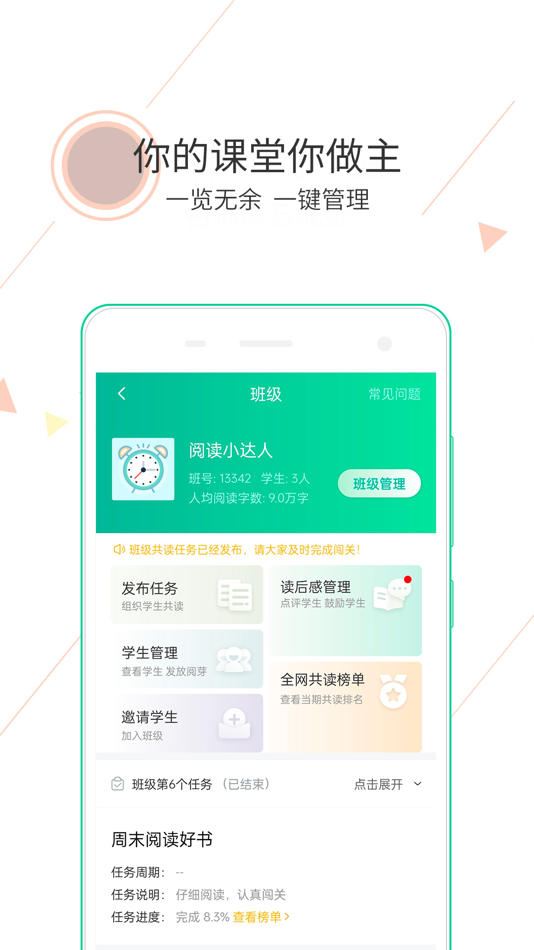 阅伴,让学生更便利的检测阅读效果,记录阅读进程,提升阅读兴趣,倍增阅读效果;让老师更便捷、更科学的管理和指导班级阅读,更显著的提升阅读、教学效果。