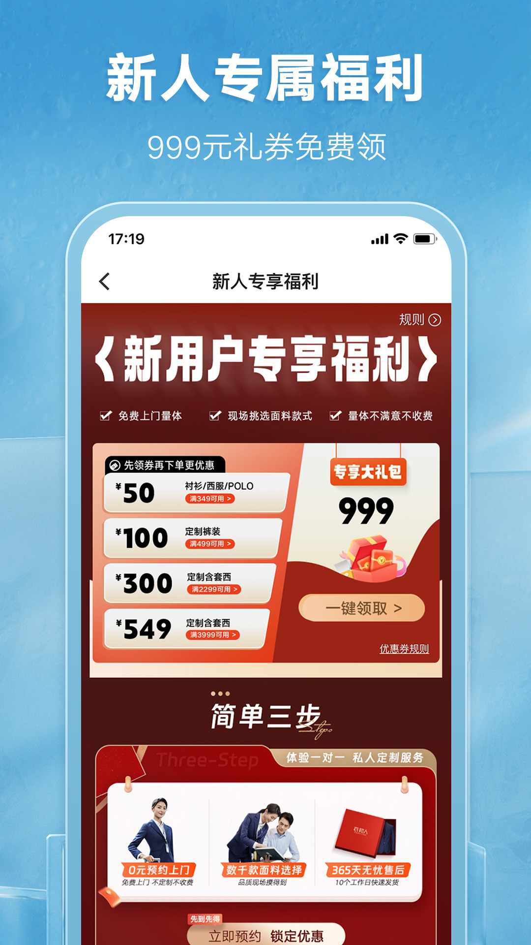 这里有超值的【新人福利】,价值999元的定制礼包可免费领取哦;【国庆大促】期间更是优惠多多,买一送一,单套定制仅需1250元;还有超棒的【免费送衬衫】活动,推荐好友就能得到大额津贴,并且还能享受免费上门量身定制衬衫的服务。
