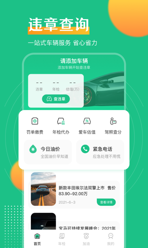 - **车主服务**:包含年检、车辆估值、油价查询等众多车务相关的服务内容。
