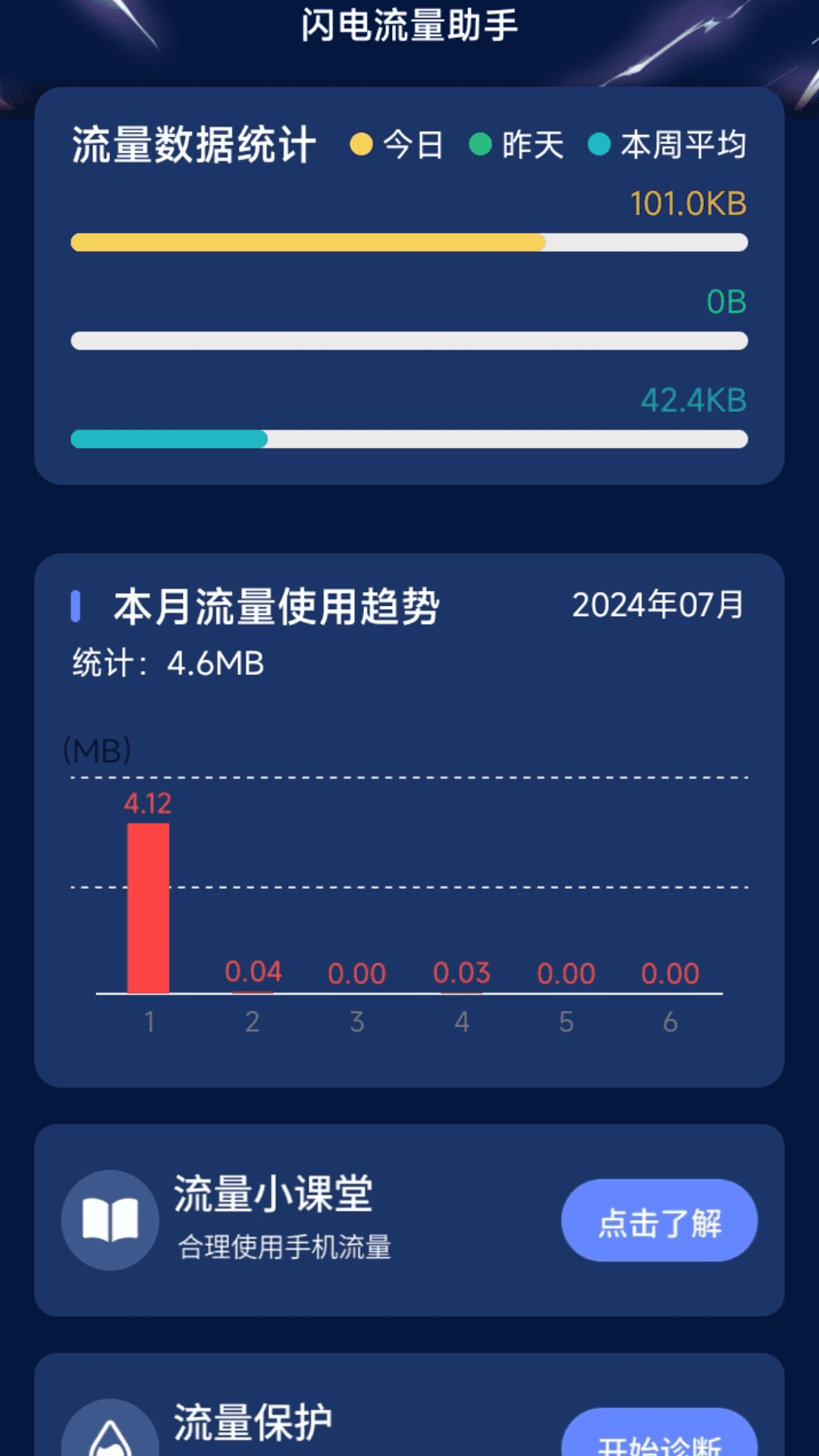 闪电流量助手的流量数据统计功能速度极快且非常准确。它能够实时监测并统计您的流量使用数据,您可以通过该功能查看每日、昨日、每周平均以及本月的流量使用趋势。这样一来,您就能够随时了解自己的流量消耗状况,从而有效避免不必要的流量超额支出。