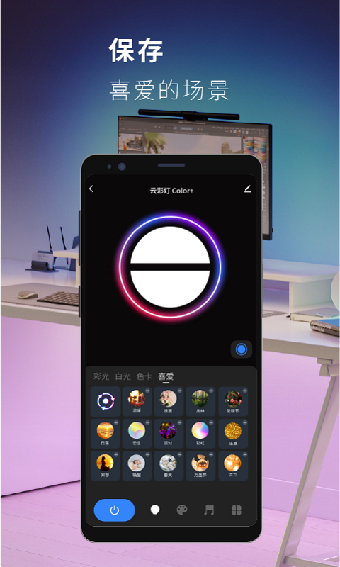 照明专家精心设计出多种灯光场景,能够瞬间切换不同的氛围光。您可以通过DIY的方式,轻松打造专属自己的氛围光,使光线与心情完美同步。这里还有光随音动、光随屏幕画面律动的奇妙功能,满满的氛围感扑面而来。