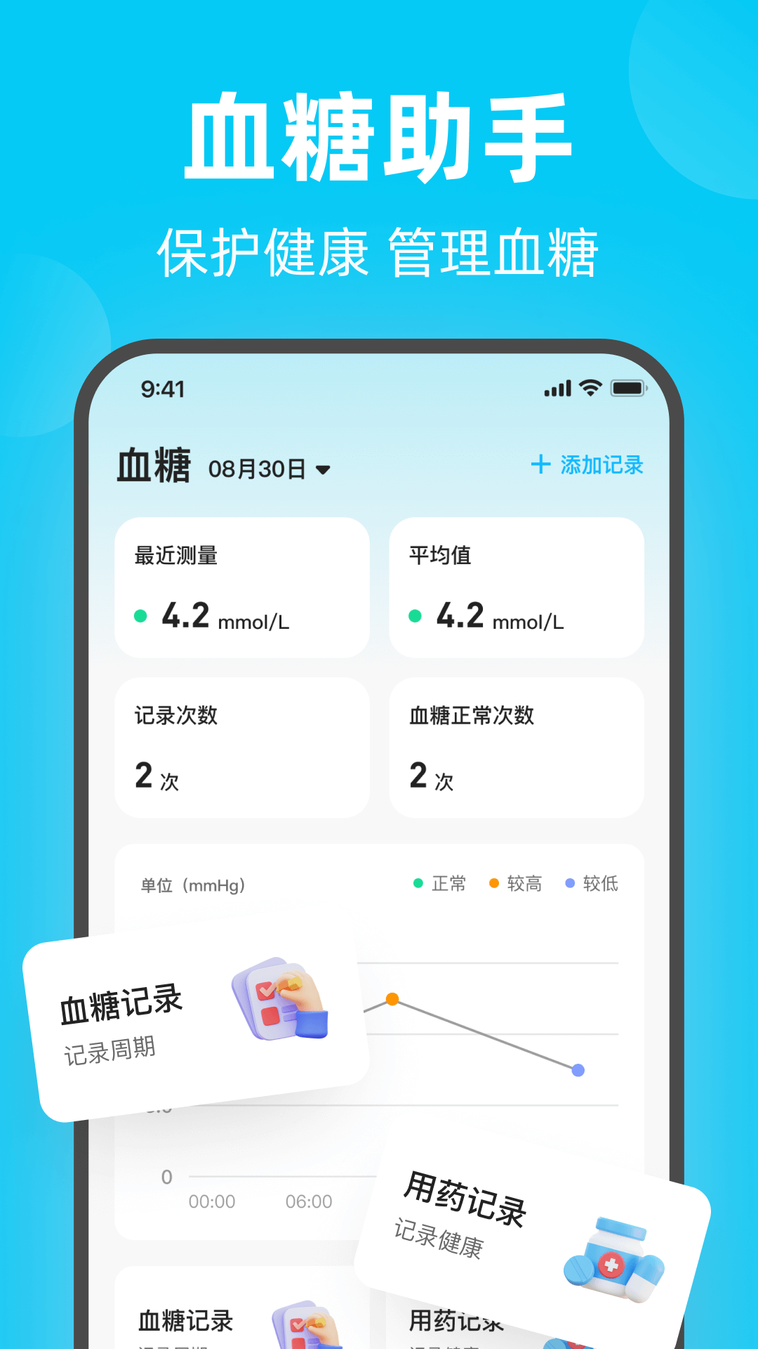 这款应用为追求健康生活的您提供了一个简单易用的血糖记录平台。它不仅帮助您追踪血糖水平,还能通过数据分析,让您更深入地了解自身的健康状况。作为您健康管理的贴心伙伴,血糖助手让您随时掌握血糖动态,支持您做出更科学的健康选择,引导您走向更加健康的生活。