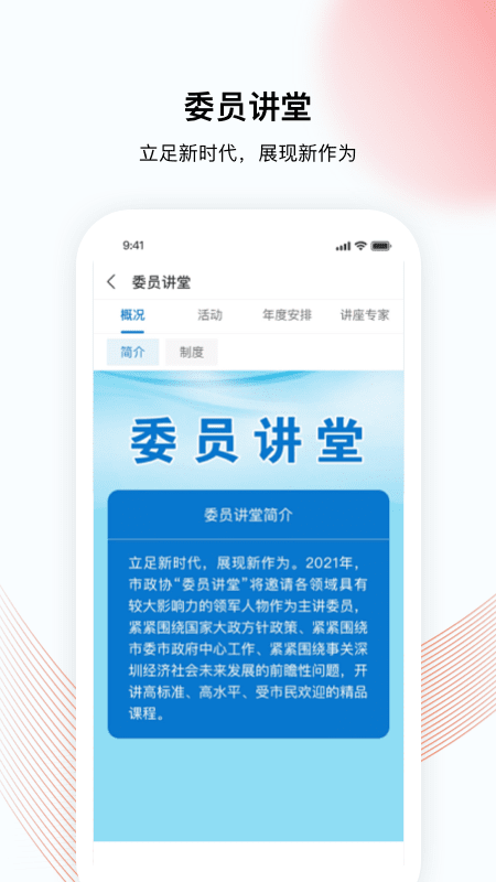 深圳政协委员移动履职平合是基于移动互联网,充分运用云计算、大数据等先进技术,以移动应用程序( APP)为载体,以服务委员履行职能和提升机关工作水平为核心任务,以政协委员和机关工作人员为核心用户,搭建统一平台,全面融合政协工作模式,具备履职、沟通、服务、管理、学习五大功能的政协网络议政、远程协商专属信息化产品。