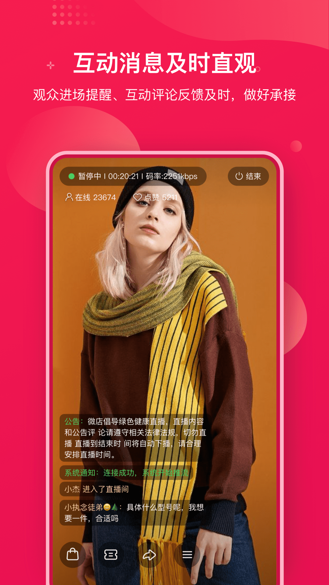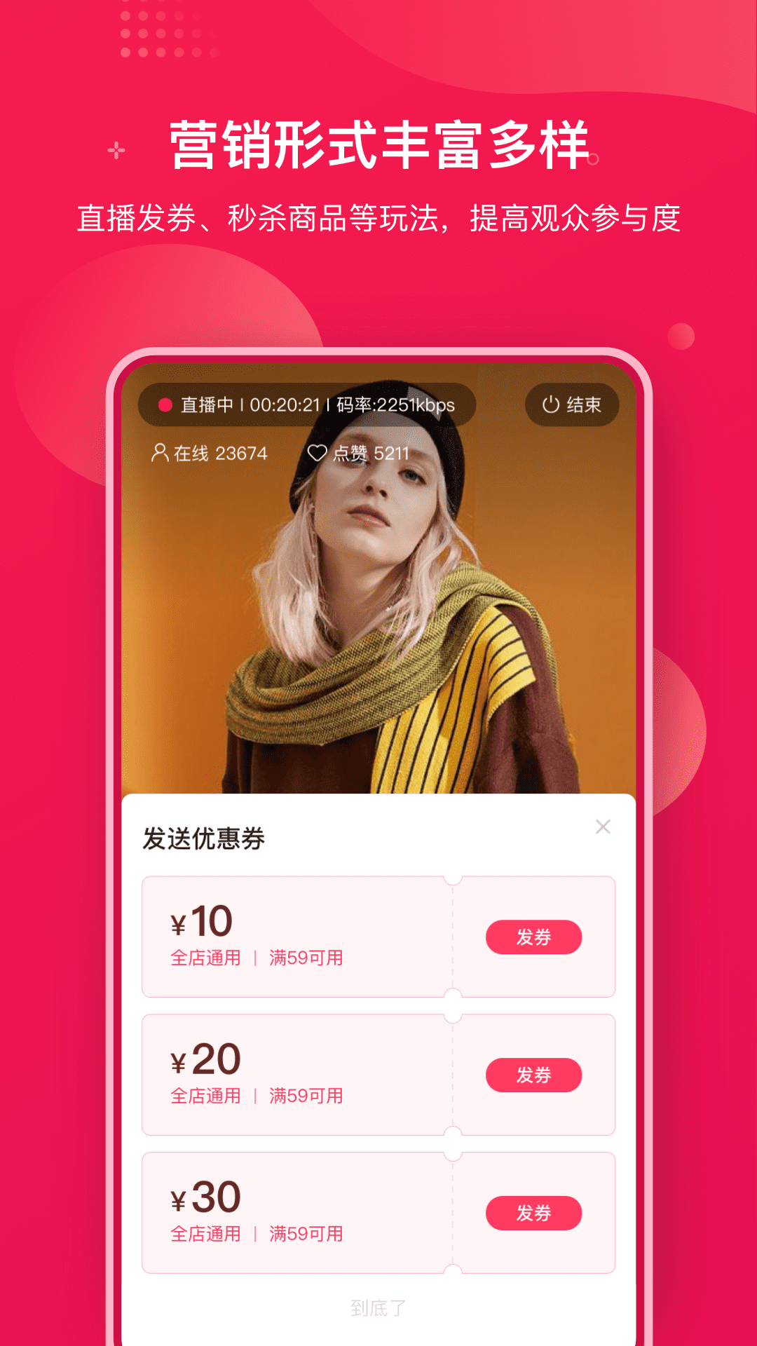 直播营销功能超齐全,像直播评论、点赞、发放优惠券促进转化等功能一个都不少,多种玩法等你来体验。