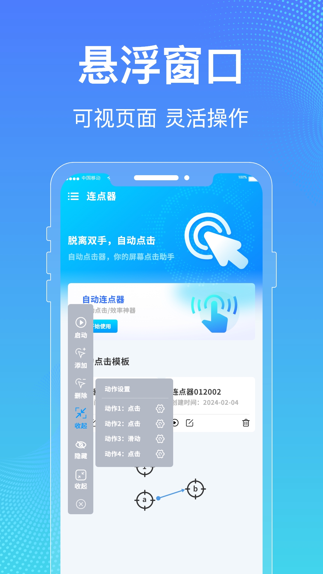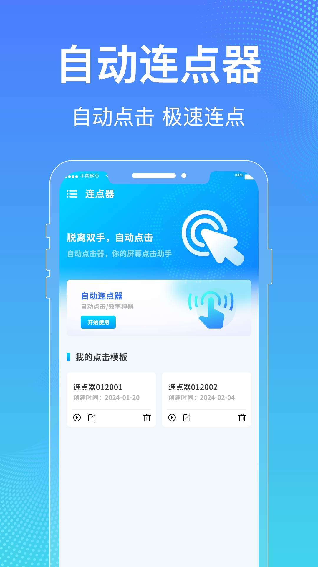 自动连点器助手:帮助广大安卓用户解放双手,实现短时间内快手连续点击加速,轻松设置点击频率;自动重复操作,轻松实现按键精灵的效果!