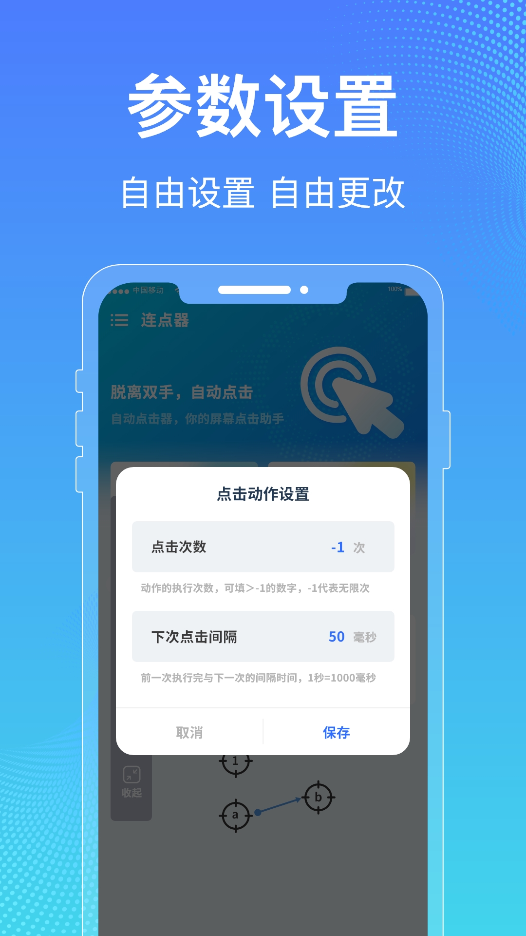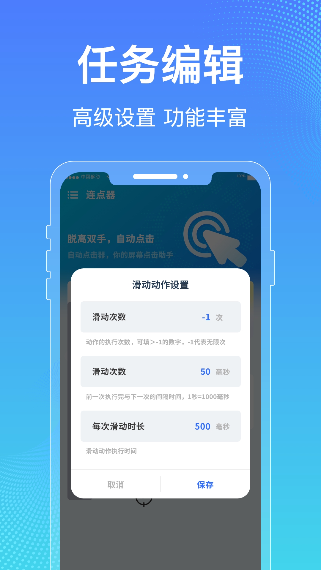 实时保存,一键启用;一键设置操作指令,保存点击脚本,下次回来继续使用,为你提供完美的点击效果