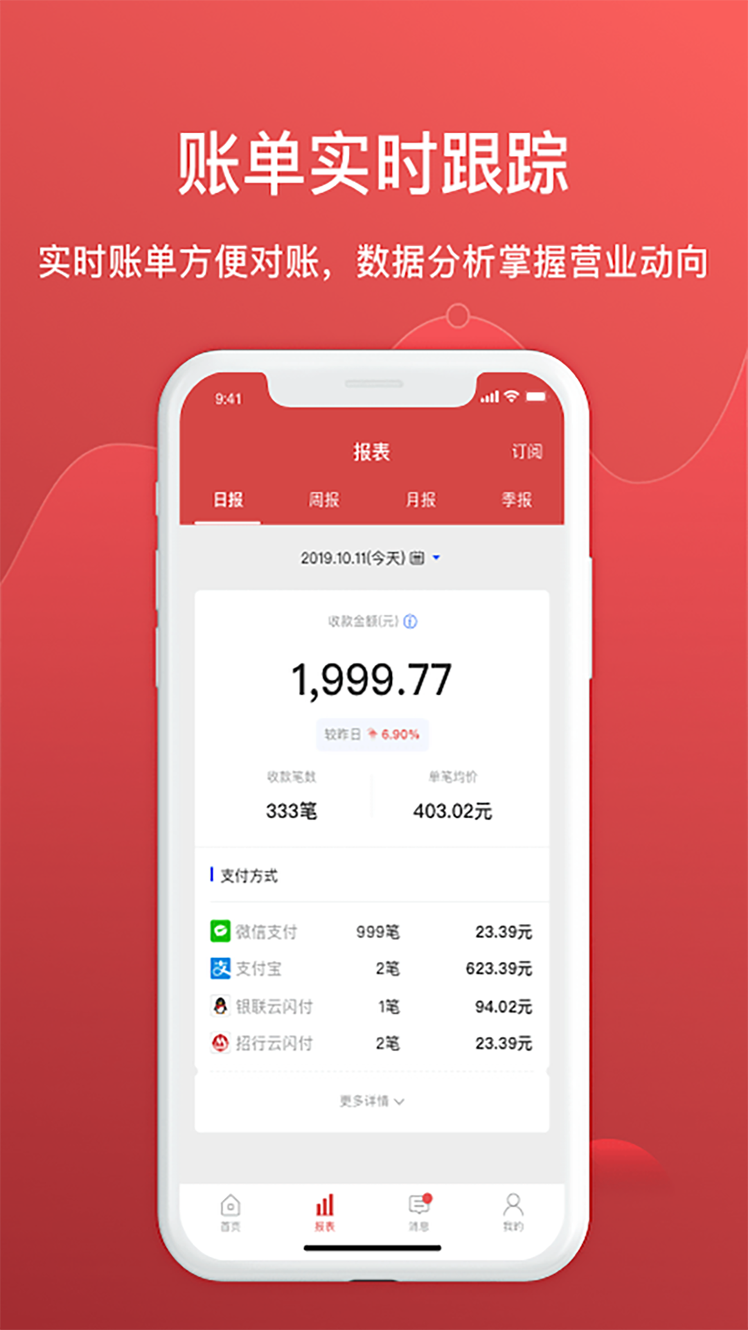 【收款】商户可快速开通多种移动支付收单方式,支持消费者扫码支付、刷卡支付,收款便捷;