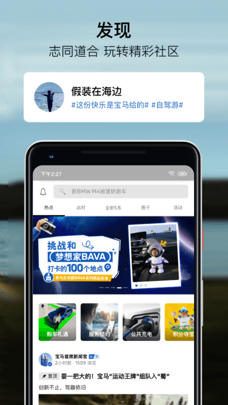发现板块:您能够与其他车友分享自己的驾驶旅程体验,同时获取全新的BMW官方资讯。