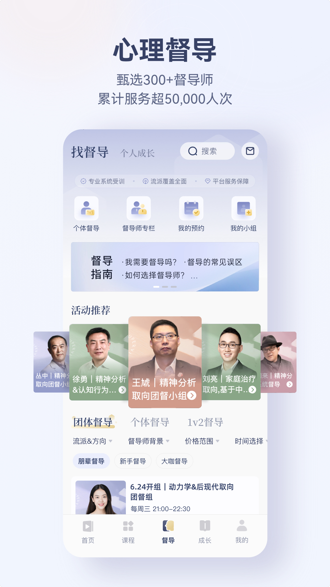 聚集300+优秀心理督导师,帮您提高咨询专业能力、探索咨询风格,让您的心理咨询职业发展少走弯路;