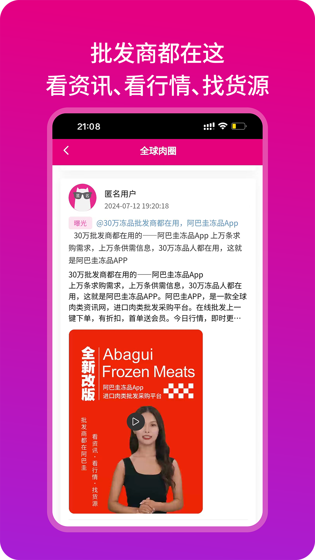 阿巴圭冻品App,这是一个汇聚全球肉类资讯的网络平台,同时也是进口肉类的批发采购平台。众多批发商都选择在阿巴圭冻品App上查看肉类资讯、了解行情走势并且寻找货源!其App的在线商城提供批发业务,而且支持全国范围内的冷链配送服务哦。