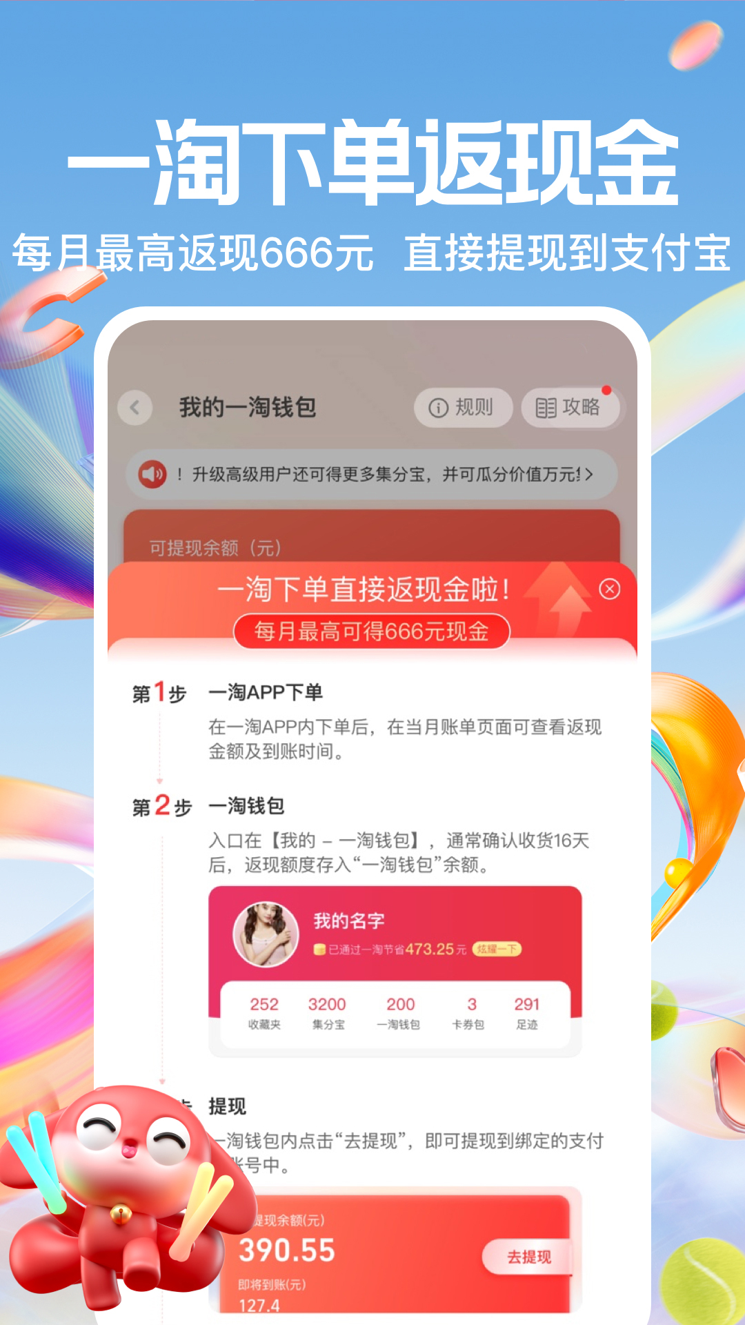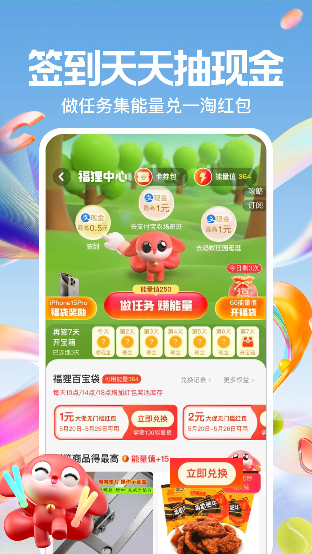 其五,一淘不只是让您省钱,还有福利哦。每天签到能抽取现金,做任务积攒能量后就可以兑换大额红包,购物时直接抵扣。
