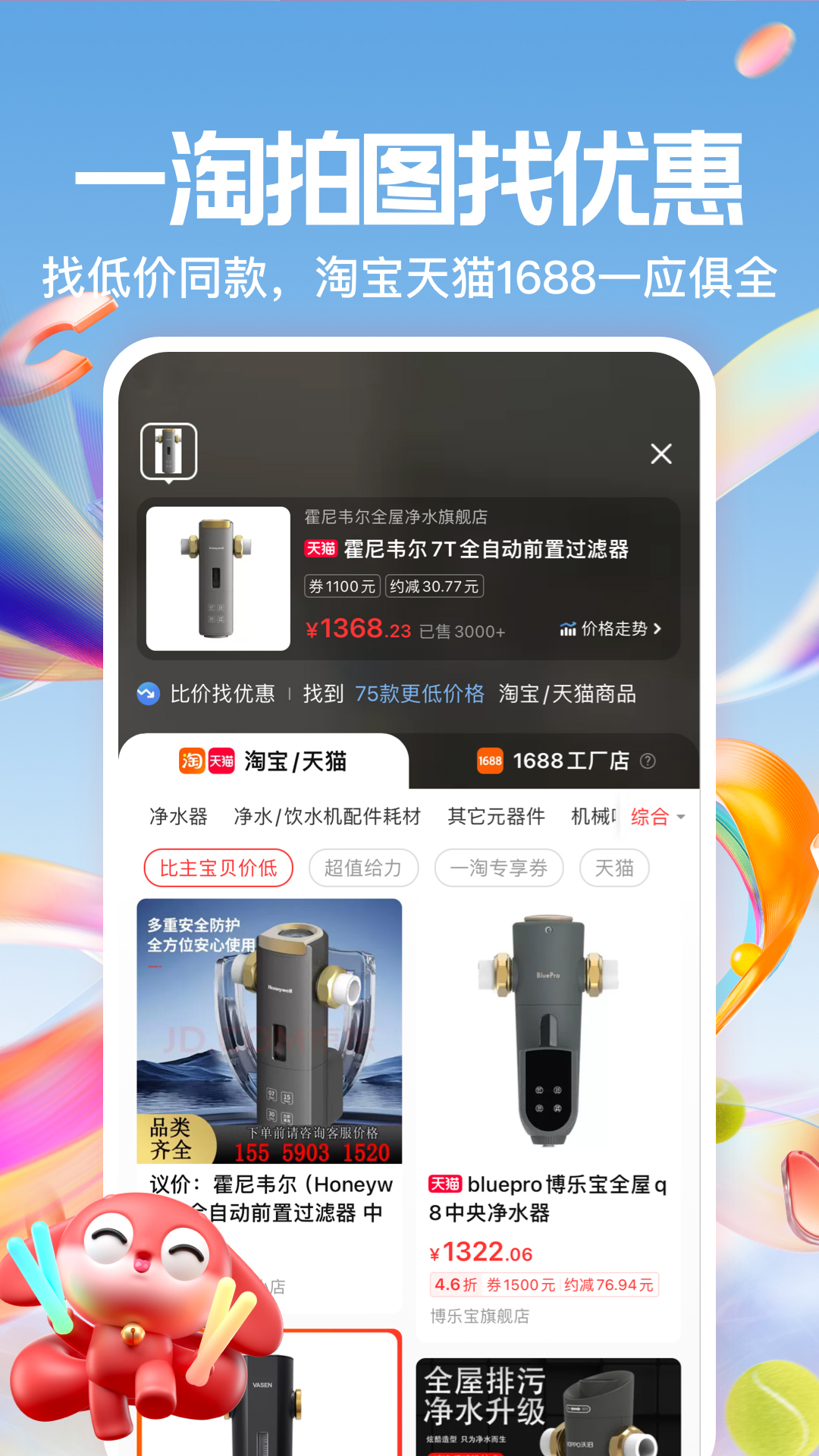 1、拍图找优惠:拍照找超值低价同款,比价更简单! 2、购物车补贴:为你找到购物车补贴优惠,来一淘下单更省钱! 3、要记得在一淘 APP下单才能享受优惠哦!