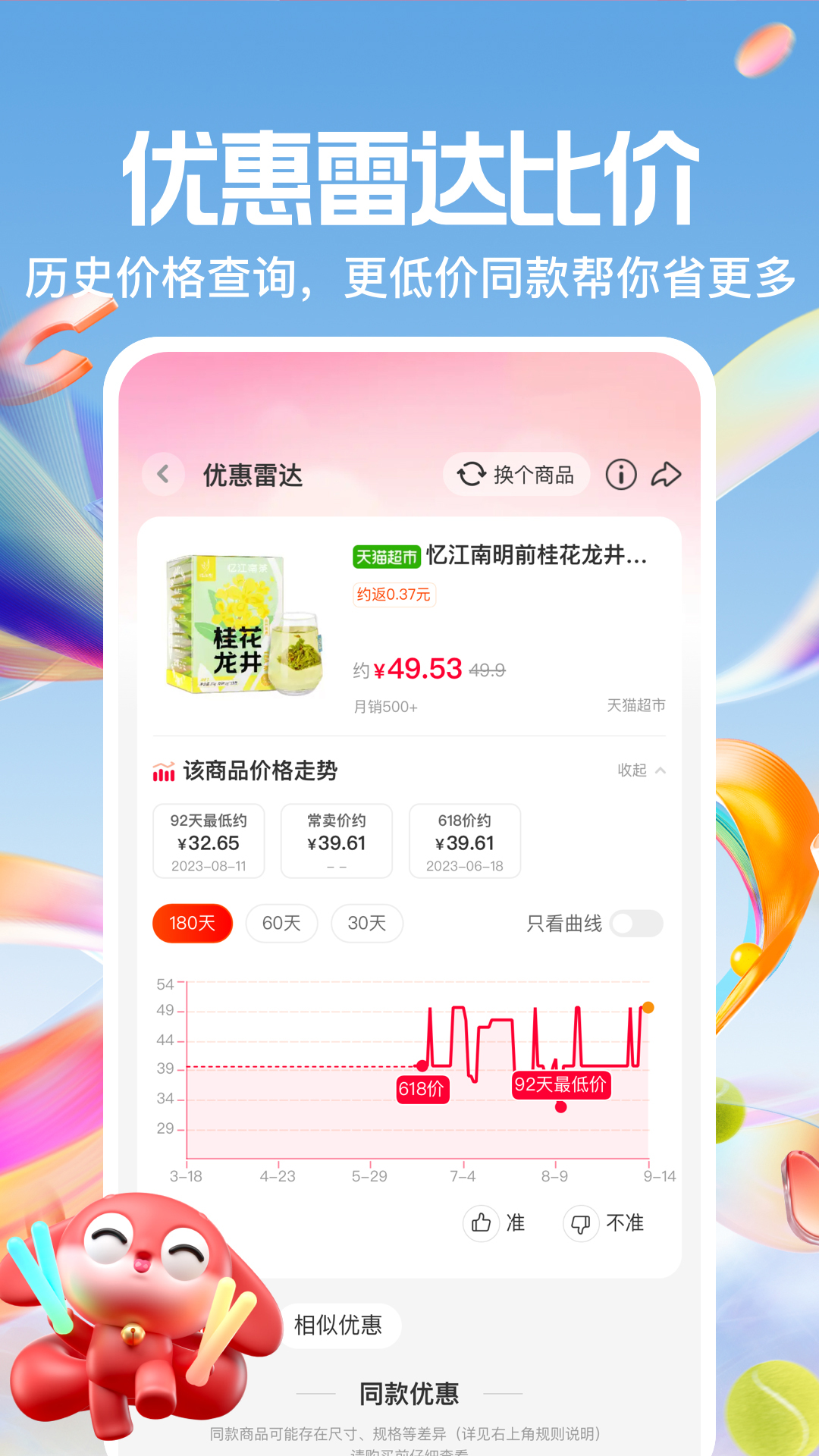 一淘还能帮您找到“同款优惠”,让您获取商品的历史折扣信息,并且会及时提醒您商品降价情况。