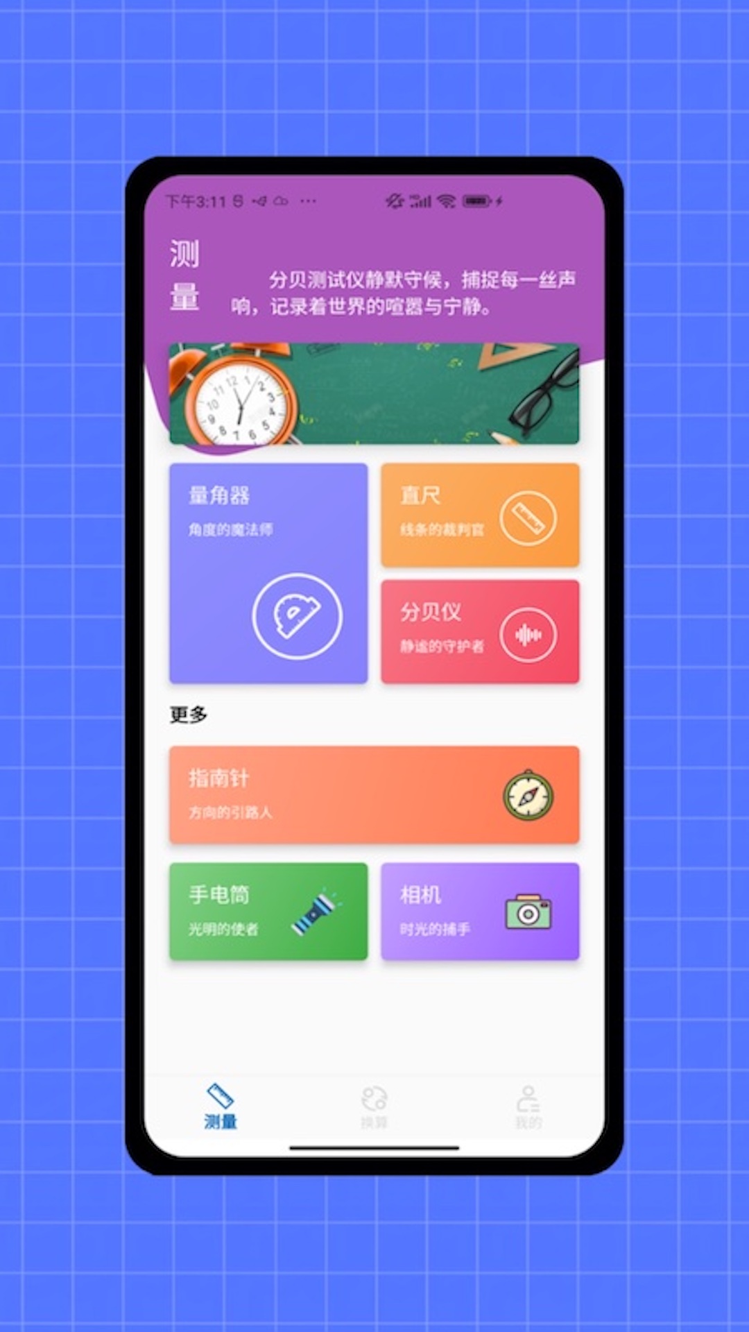 本款软件是一款小工具功能的集合,它包含尺子,分贝测量仪,量角器,这些常规小功能,另外又支持指南针,单位换算这些小工具,使用它用户真正能感受到设计师对这款产品的用心设计。