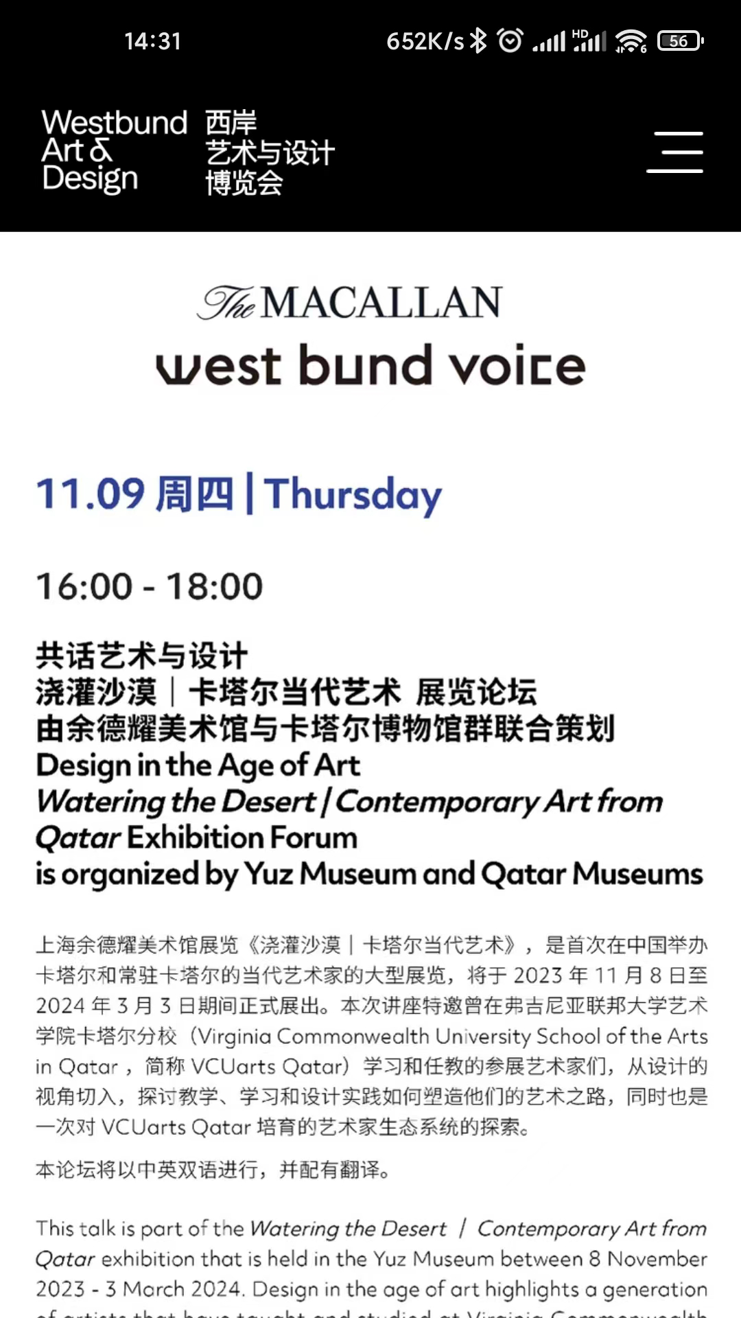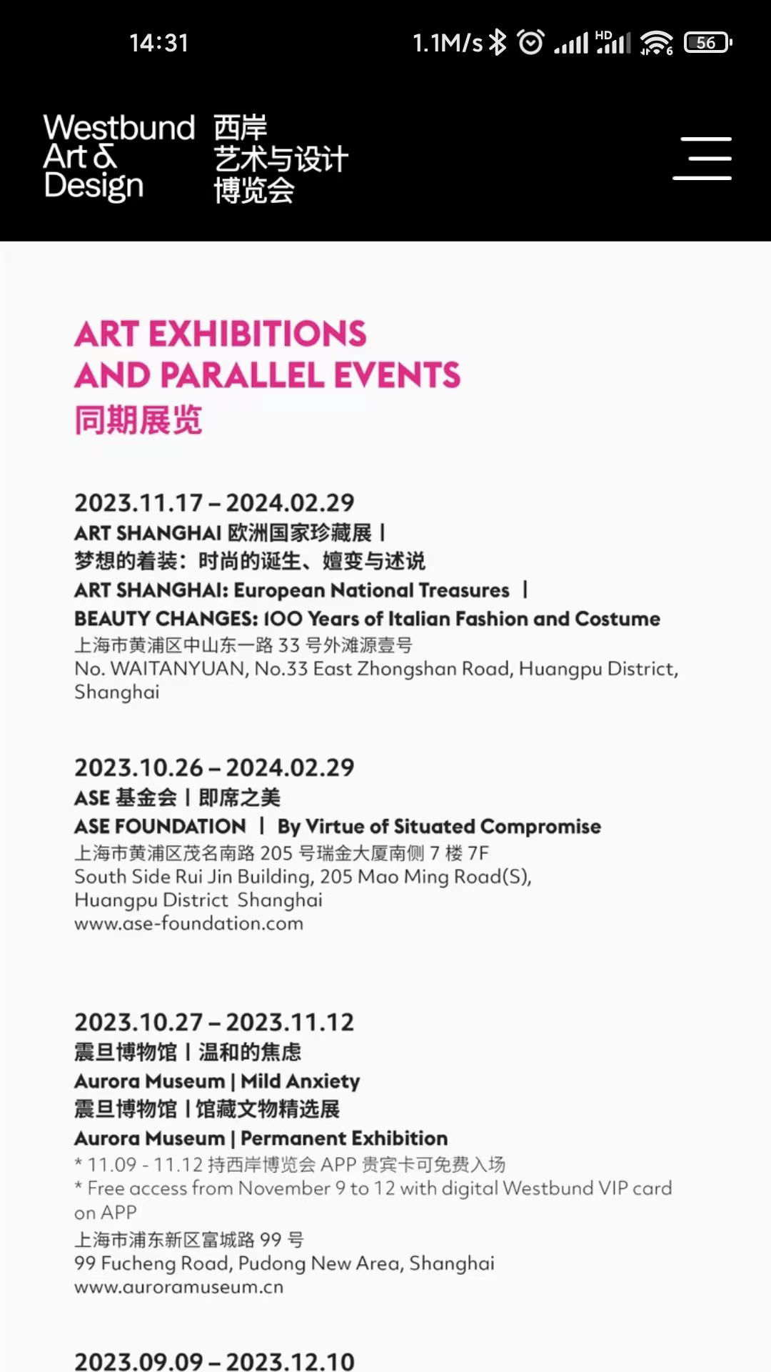 这里是上海西岸艺术与设计博览会官方信息的发布平台,你可以在此获取诸多相关资讯,如展出信息、参展画廊的相关情况、参展艺术家的信息、有关论坛的详情、每日活动安排、活动导览内容以及相关地图信息等。