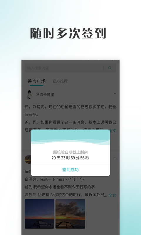 为了精准地核实大家的状态,善言软件规定只能由本人签到,签到周期由用户自己设置,要是在周期内未签到,就会收到客服小姐姐的催签啦。