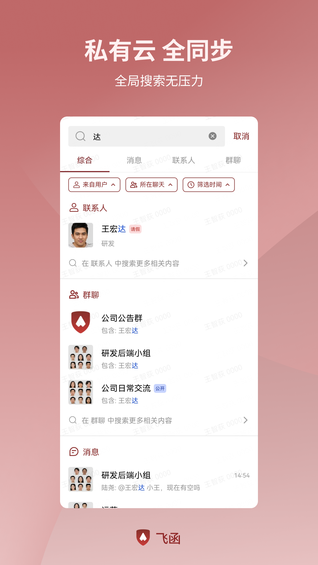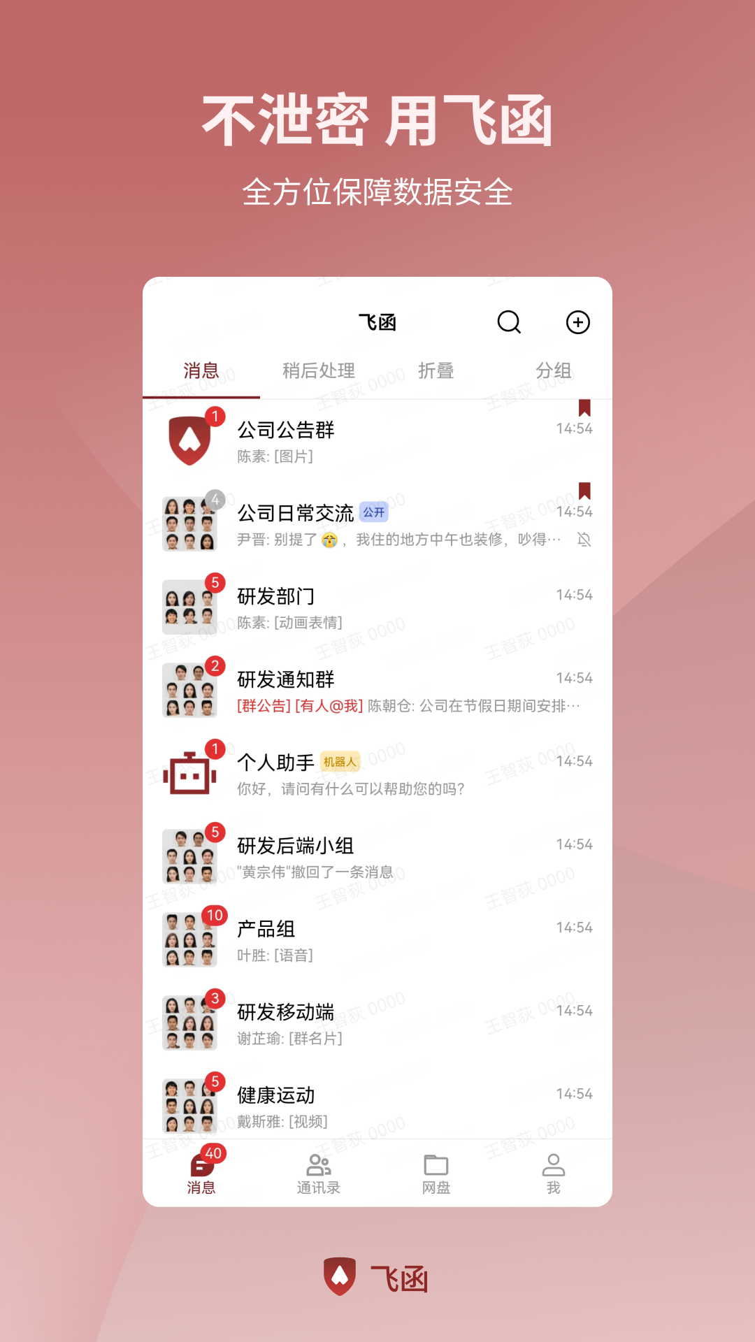 飞函将所有数据加密存于客户所提供的服务器之上,无论是公有云、私有云、混合云,还是单机加密部署,都能得到支持。在数据的收发、传输以及存储的整个链路过程中均进行加密处理,国密算法、安全水印、设备安全管理、消息审计、追踪溯源等功能也都具备,并且能够接受源代码审计。