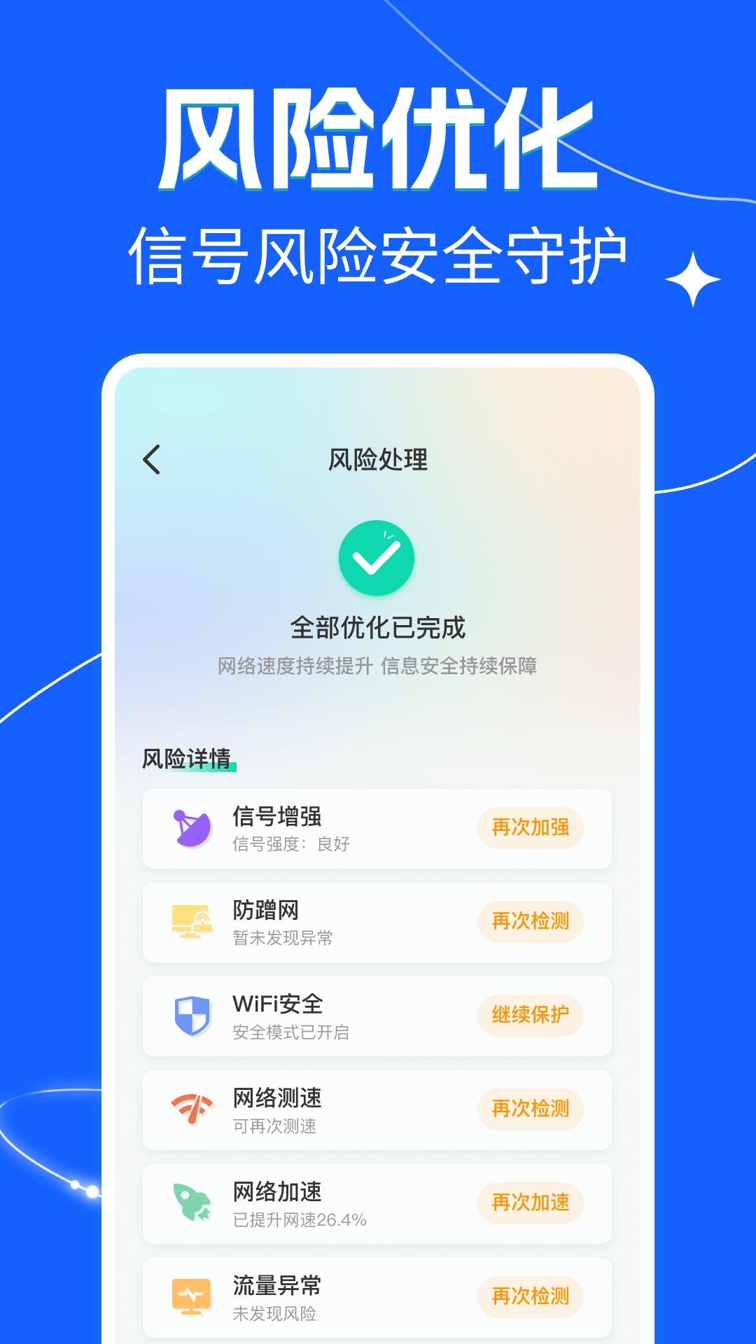 2.信号增强:深度分析当前wifi信号,一键处理开启信号增强,刷视频、玩游戏更加流畅、快速!