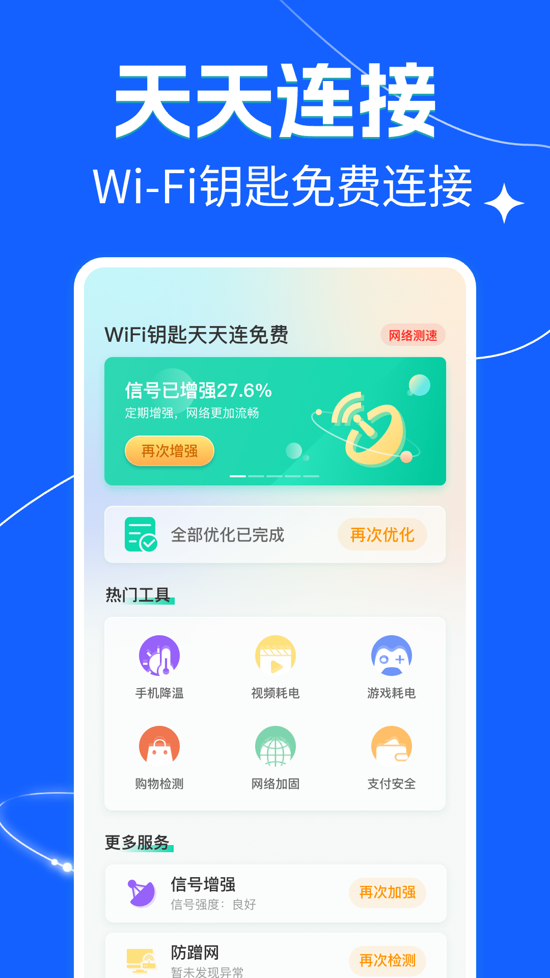 WiFi钥匙天天连免费是一款具有防蹭网、信号增强、WiFi测速、保护WiFi安全的安全上网软件