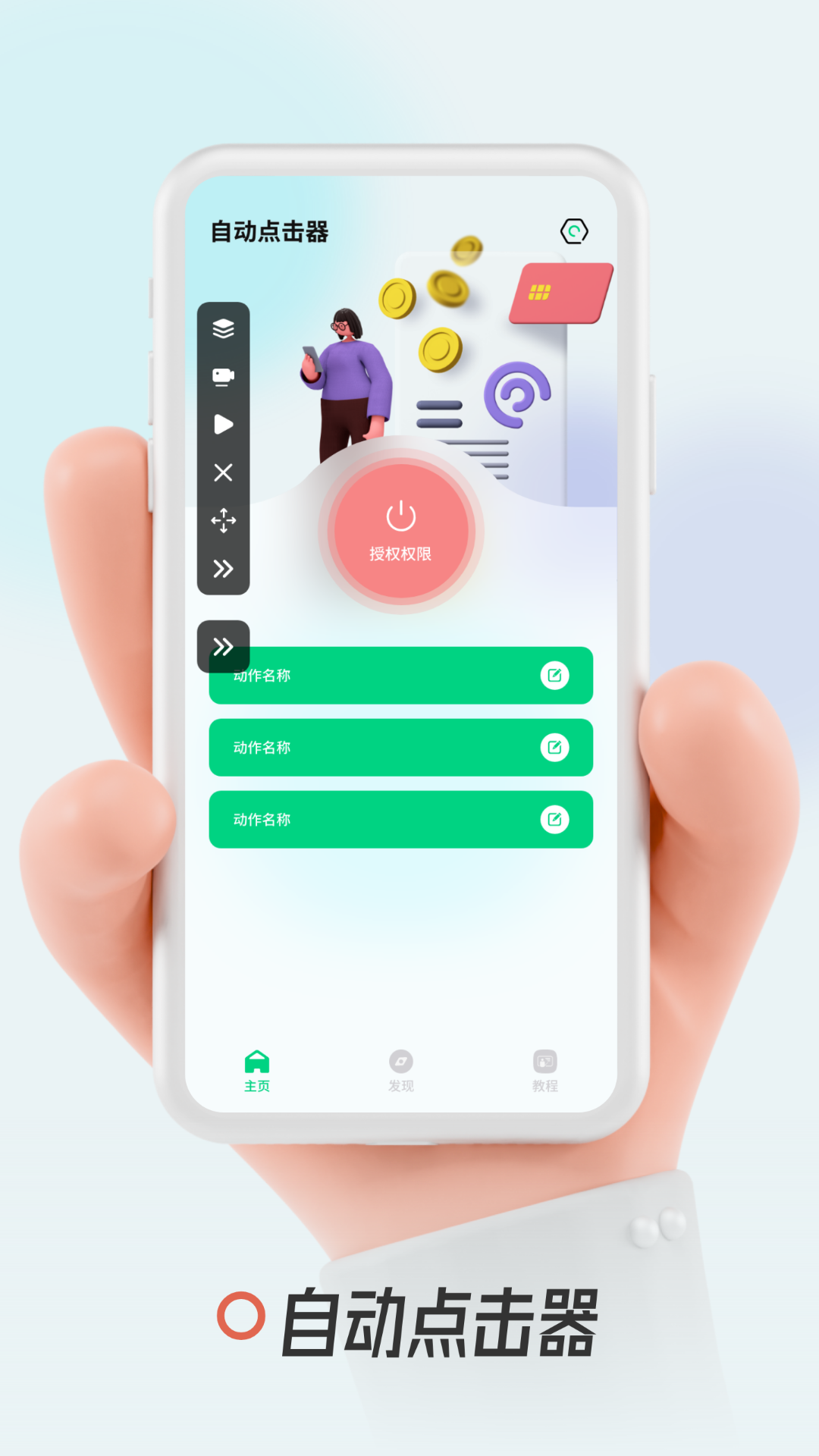 超人连点器,是一款Android自动模拟点击工具。类似于PC的按键精灵。可以自动点击、长按、滑动等手势。