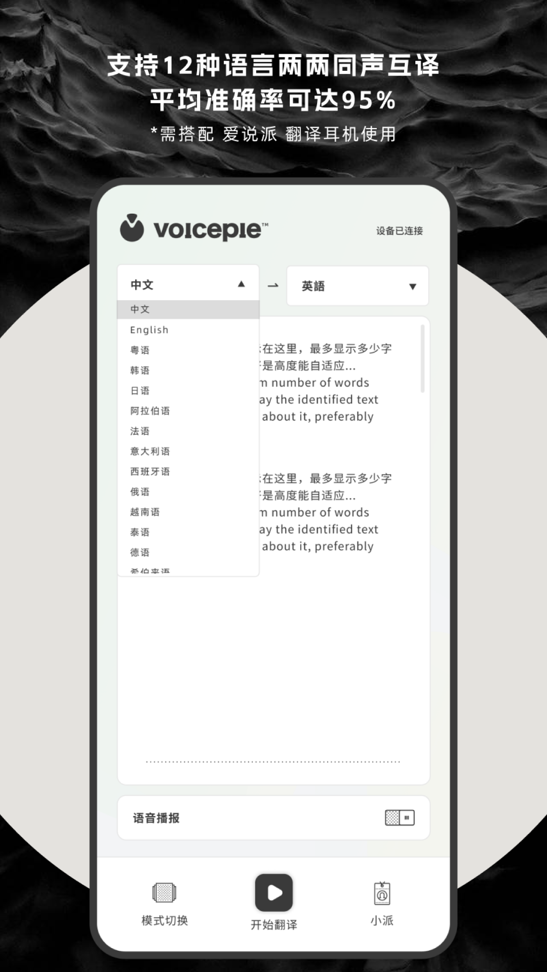 爱说派软件需与爱说派翻译耳机(爱说派TransBuds通话翻译耳机)配套使用。该软件目前能够对19种以上的语言进行实时互译,并且还在持续增加更多语种,其翻译正确率达95%之高。