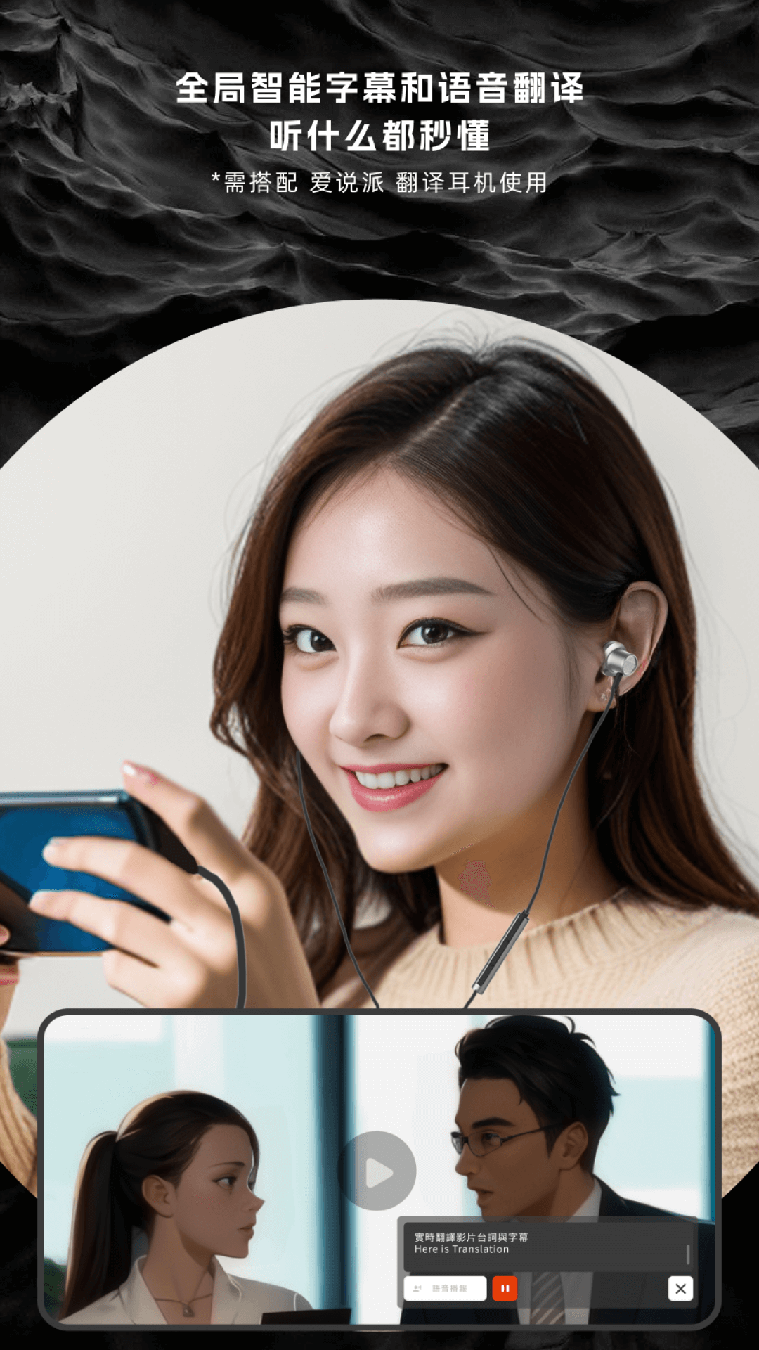 - 在听书、观影、观看短视频等情况下,爱说派可以自动翻译第三方应用的音源,呈现双语字幕,并且能够收听原文和译文语音。
