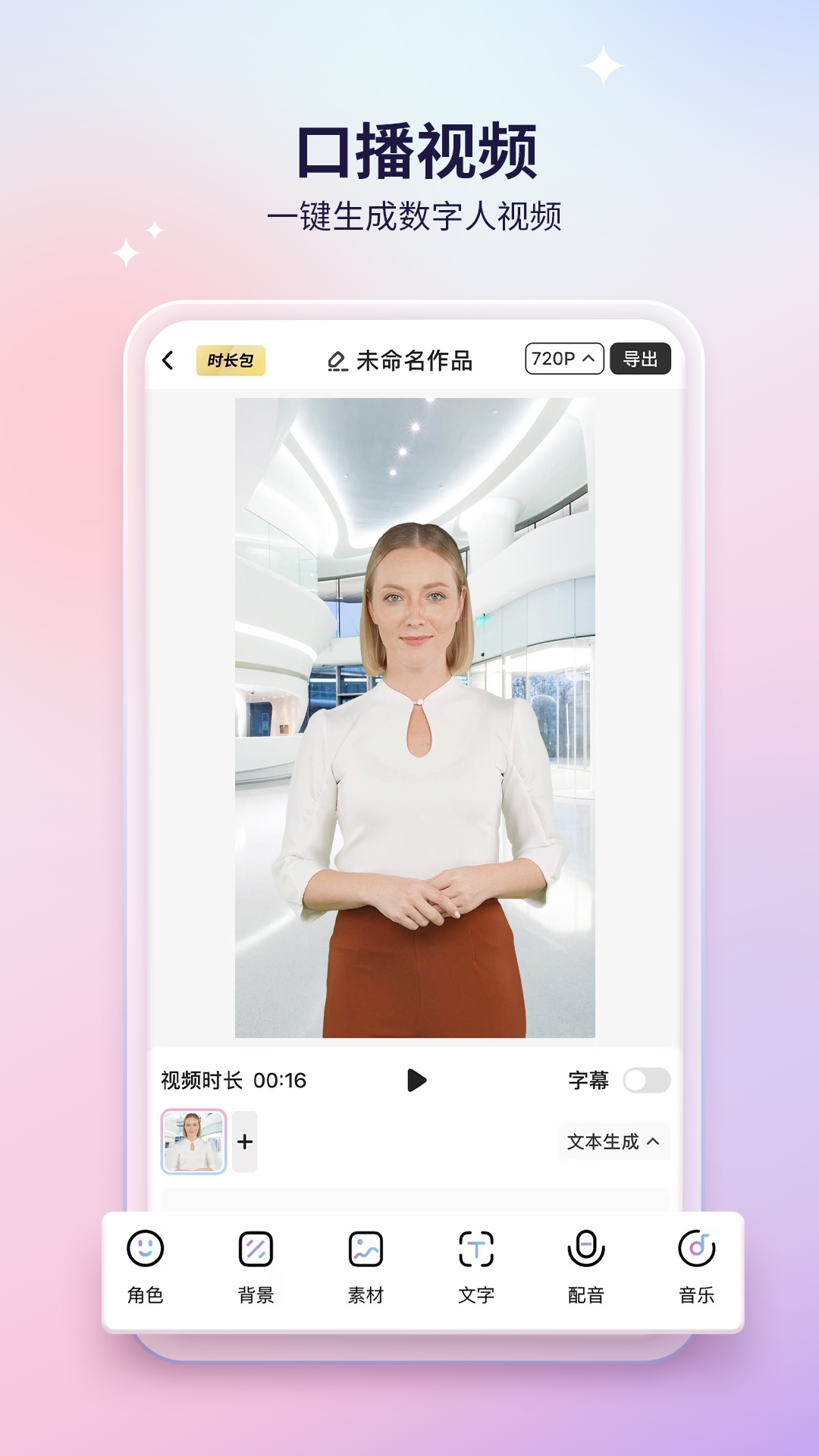 「口播视频」您能够根据自身需求选择角色,输入文本即可轻松完成视频创作。