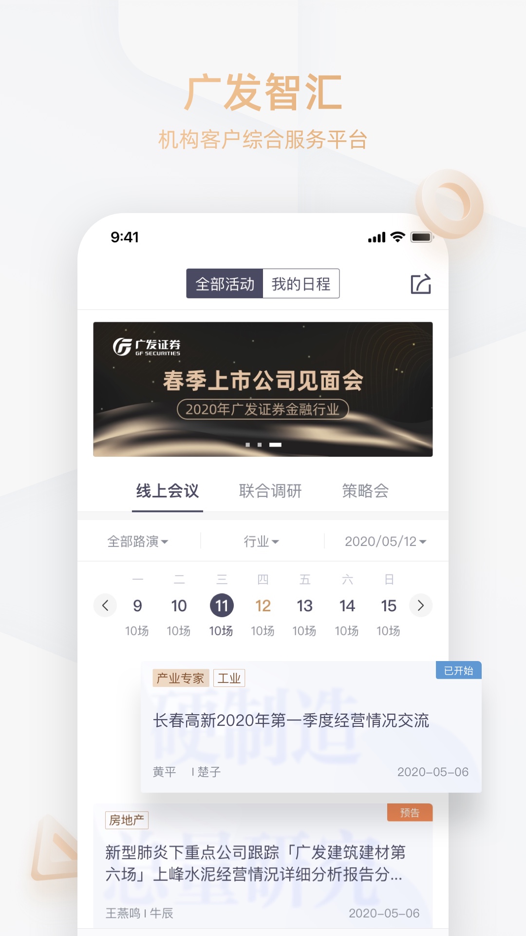 广发研究中心多地活动在线查看,一键报名,包括线上会议、调研活动、大型策略会及直播回放等精彩活动尽在广发智汇,满足客户各种使用场景