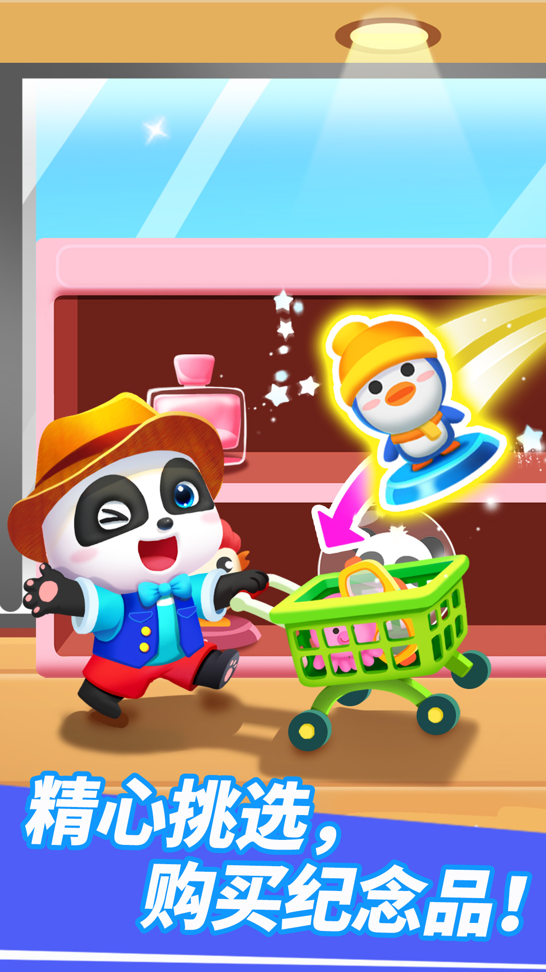 机场的商铺已经升级喽,赶快去逛一逛吧。在服装区,可以自由挑选各种各样的服装;精选零食区里,丰富的美食能够满足味蕾的期待;还有纪念品区呢,企鹅摆件、熊猫水晶球等等,宝宝可以任意选择哦。
