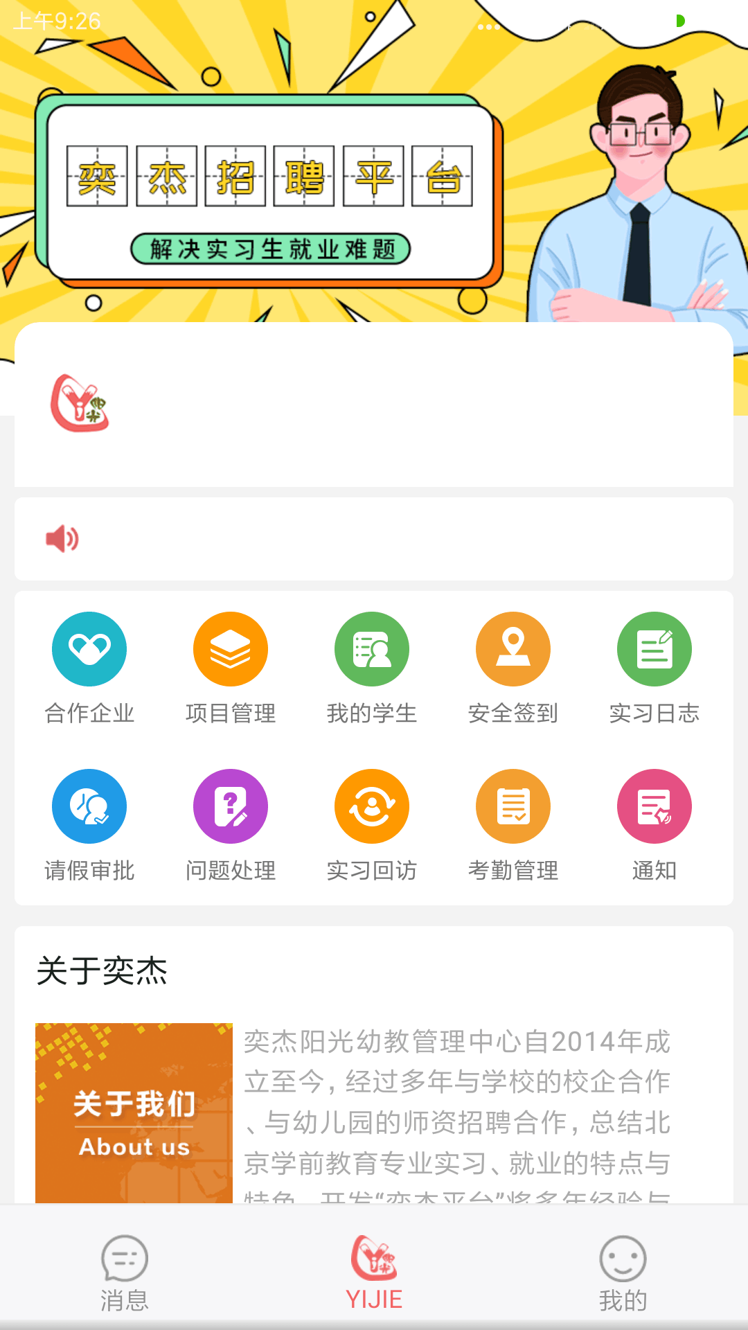 奕杰阳光 - 院校端APP是一款专注于各大院校实习生管理的移动端云服务信息系统。该APP具有多种实用功能,比如为院校提供实习生就业招聘服务,方便院校组织招聘相关事宜;实习生可通过它撰写实习日志、进行实习总结,这有助于院校及时了解实习生的实习进展和收获;同时,实习生还能利用此APP进行问题反馈,遇到问题时可及时向院校反映,也可提交请假申请等。总之,这是一款能够实现实习生实习安全管理以及实习过程全流程管理的软件。