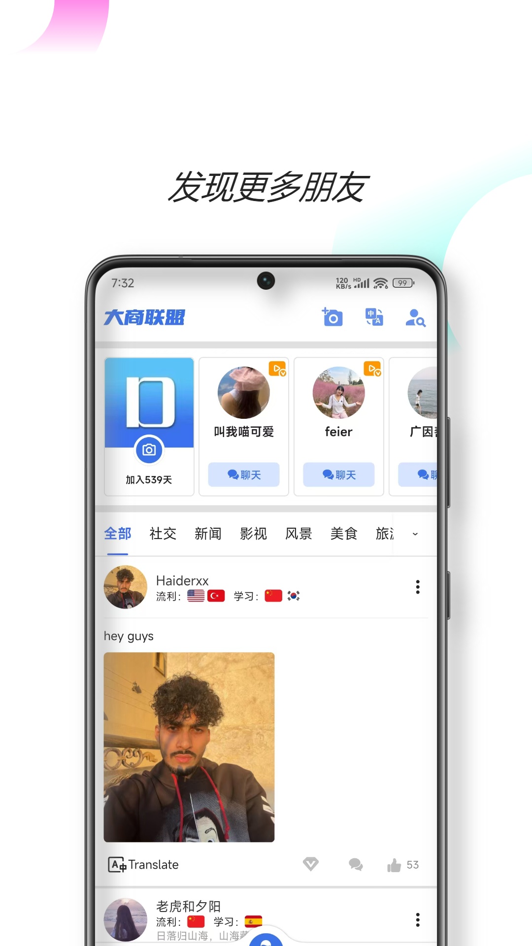 大商联盟是一个能助力全球用户构建联系、结交新友并学习新语言的平台。它致力于冲破地域与文化的藩篱,使不同国家和具有不同文化背景的人都能够便捷地交流互动,从而加深对彼此的认识并增进友谊。
