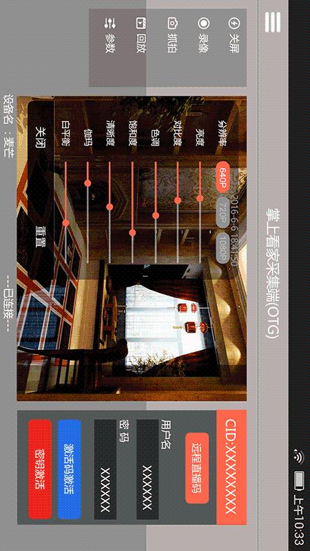 - 打开观看端软件,添加采集端的cid、用户名和密码,这样就可以实现远程查看手机USB摄像头采集的图像了。