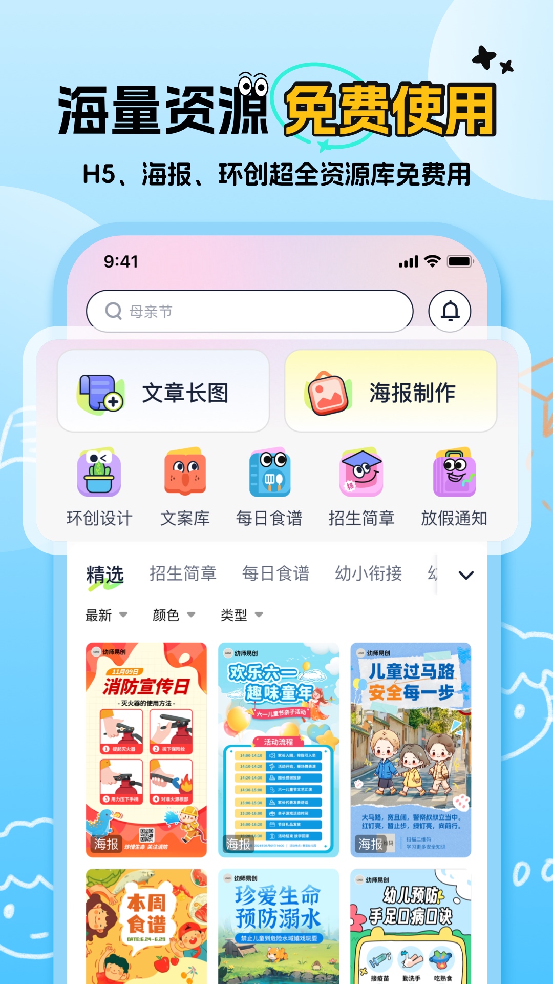 幼师易创,这是一个专门为幼师打造的设计模版库哦。这里面有着海量的资源,像海报、环创、公众号相关的资源那是应有尽有,简直就是幼师们工作时超得力的助手呢!