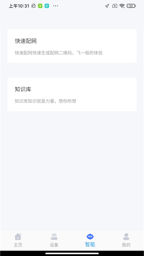 这里提供了快速配网功能,还为部分产品提供了方便的扫码或者配置打印机的二维码。另外,新增了知识库,您可以依据当前INSMO设备的类型查找相关问题,并查看所需的知识内容。