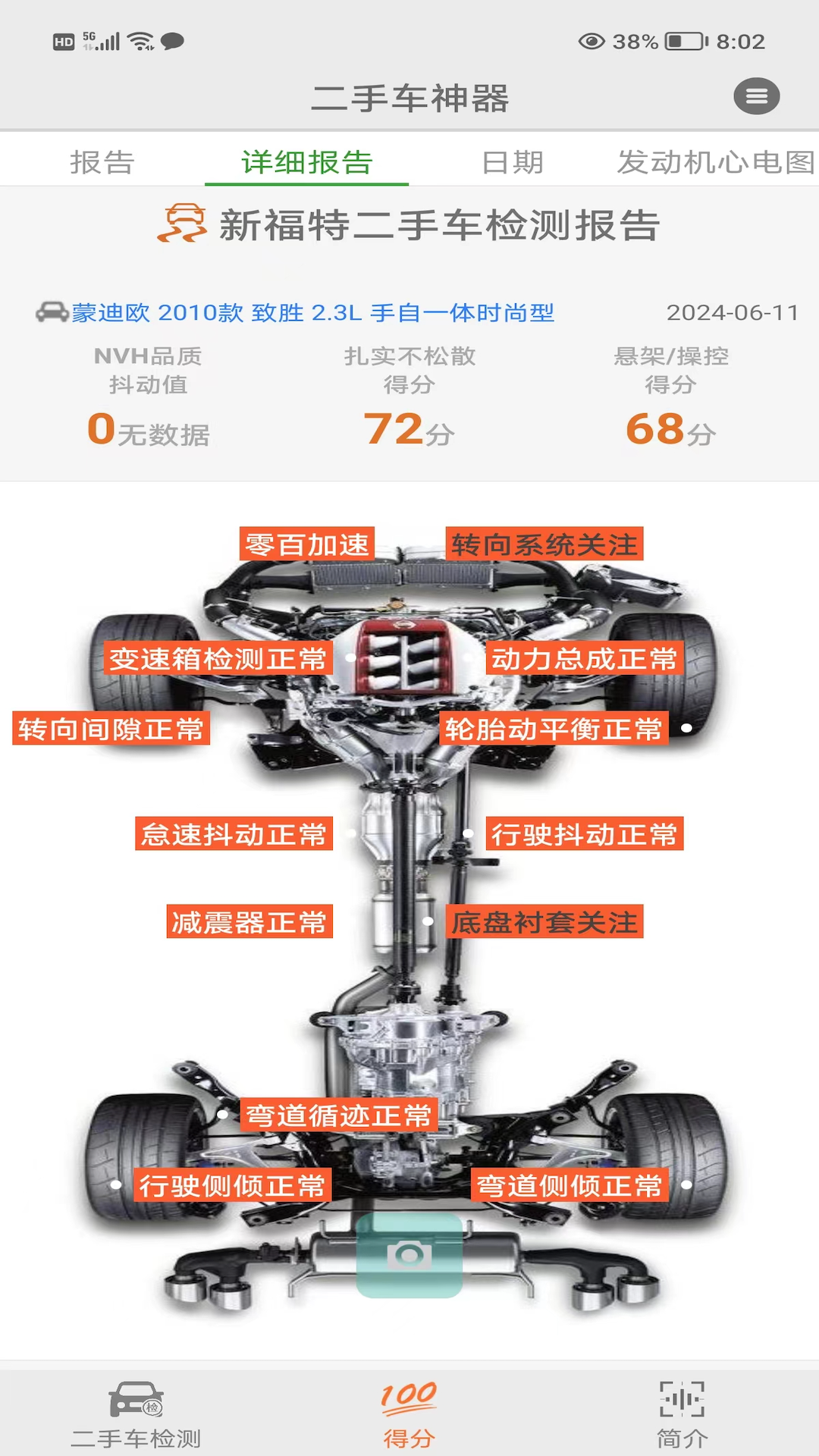 本应用针对二手车及购买二手车的场景,特别设计针对性的测试方法,包括动力不足测试、离合测试、内场制动测试,针对事故车,加强了结构变形的检测及相关算法,减少购买到存在结构变形和严重安全隐患车辆的风险