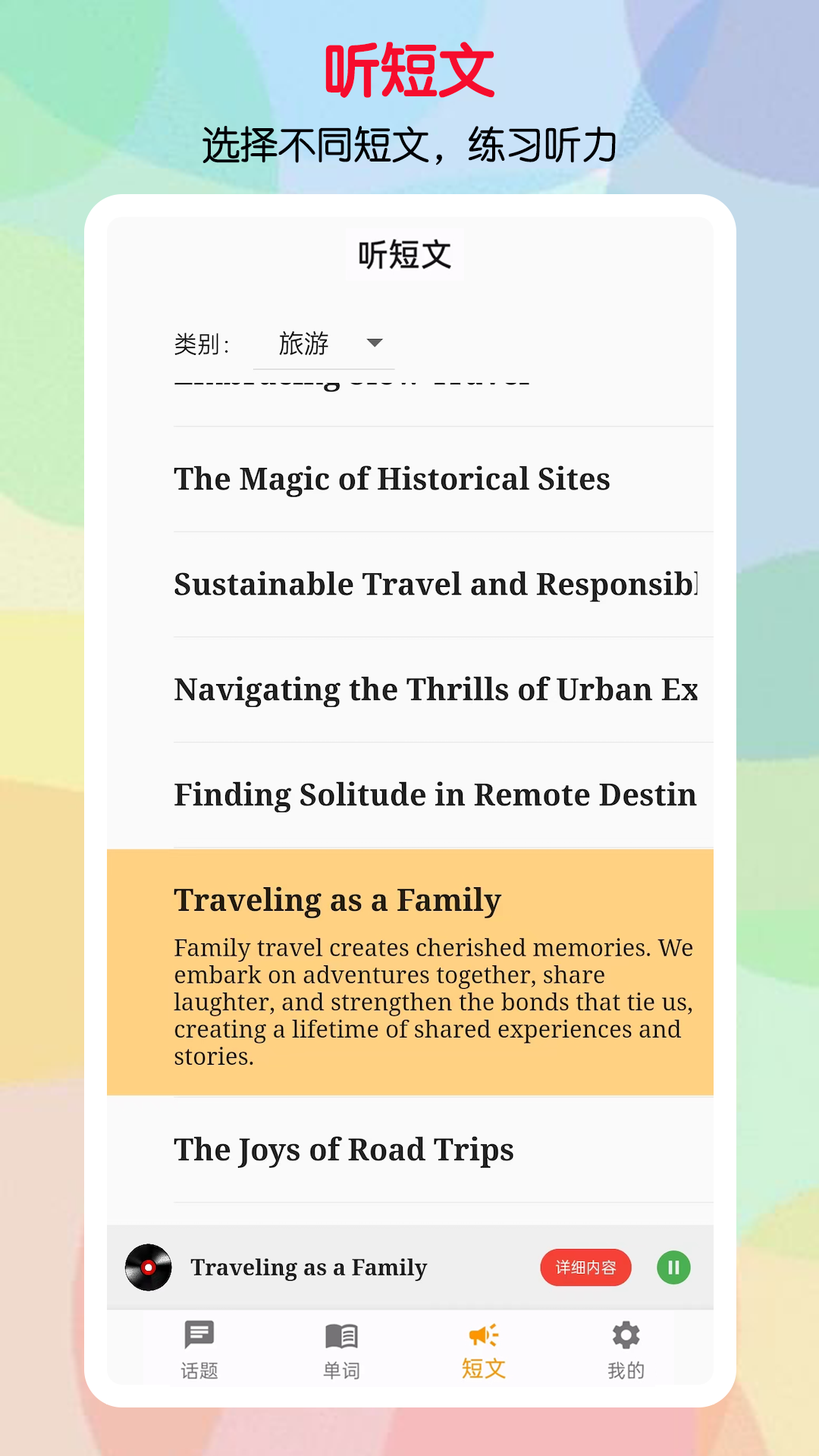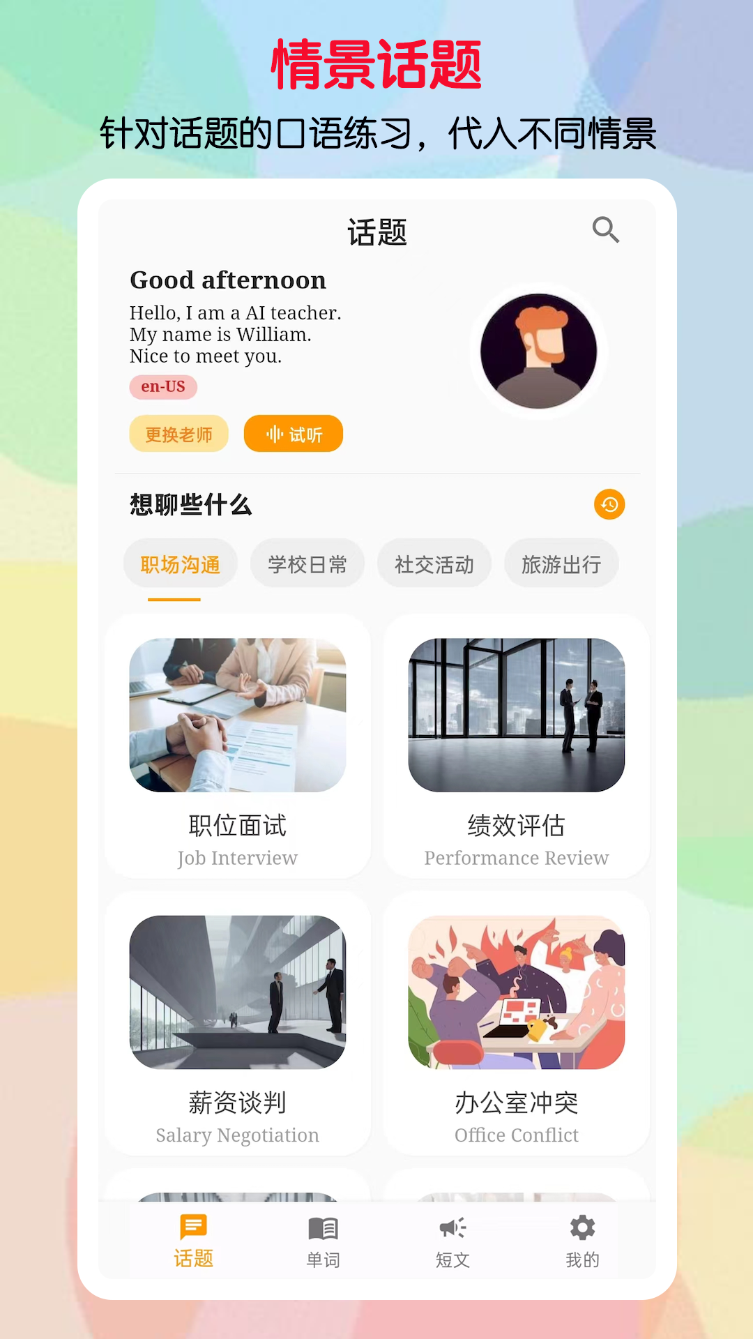 - 具备多个情景话题,像旅游、工作、社交等,能让您代入不同的英语口语情景进行练习。