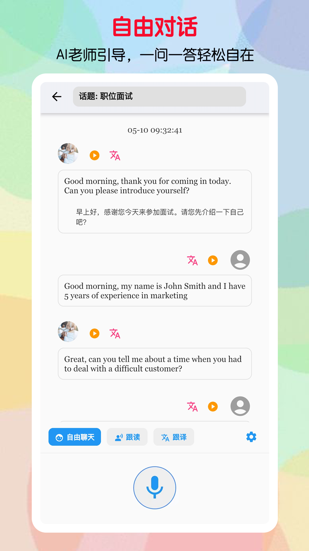 - 设有自由聊天、跟读模式、跟译模式,贴心引导您的口语学习。