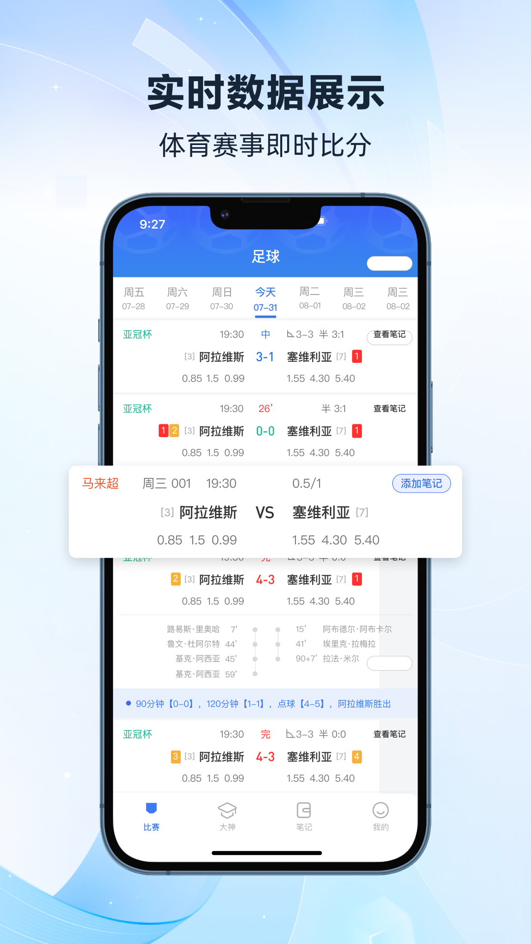 全新的赛事列表展示,让您一目了然,新增的添加笔记入口,让您可以快速便捷进入笔记创作,同时也可以在比赛列表点击查看笔记,快速的进入笔记创作页面进行编辑、修改、删除等。未来比赛列表将会加入更多辅助功能,如赛事转播,动画直播等。