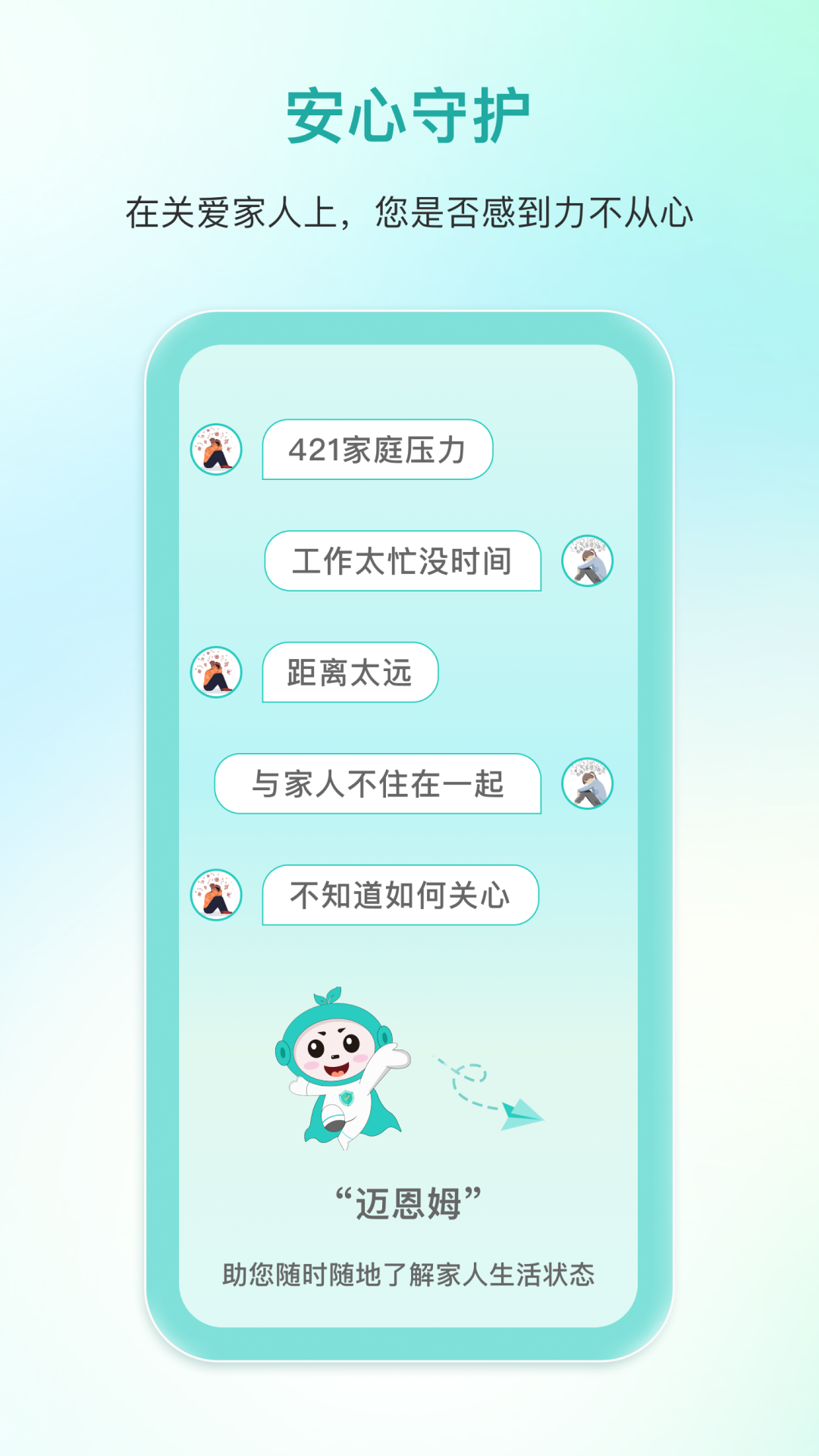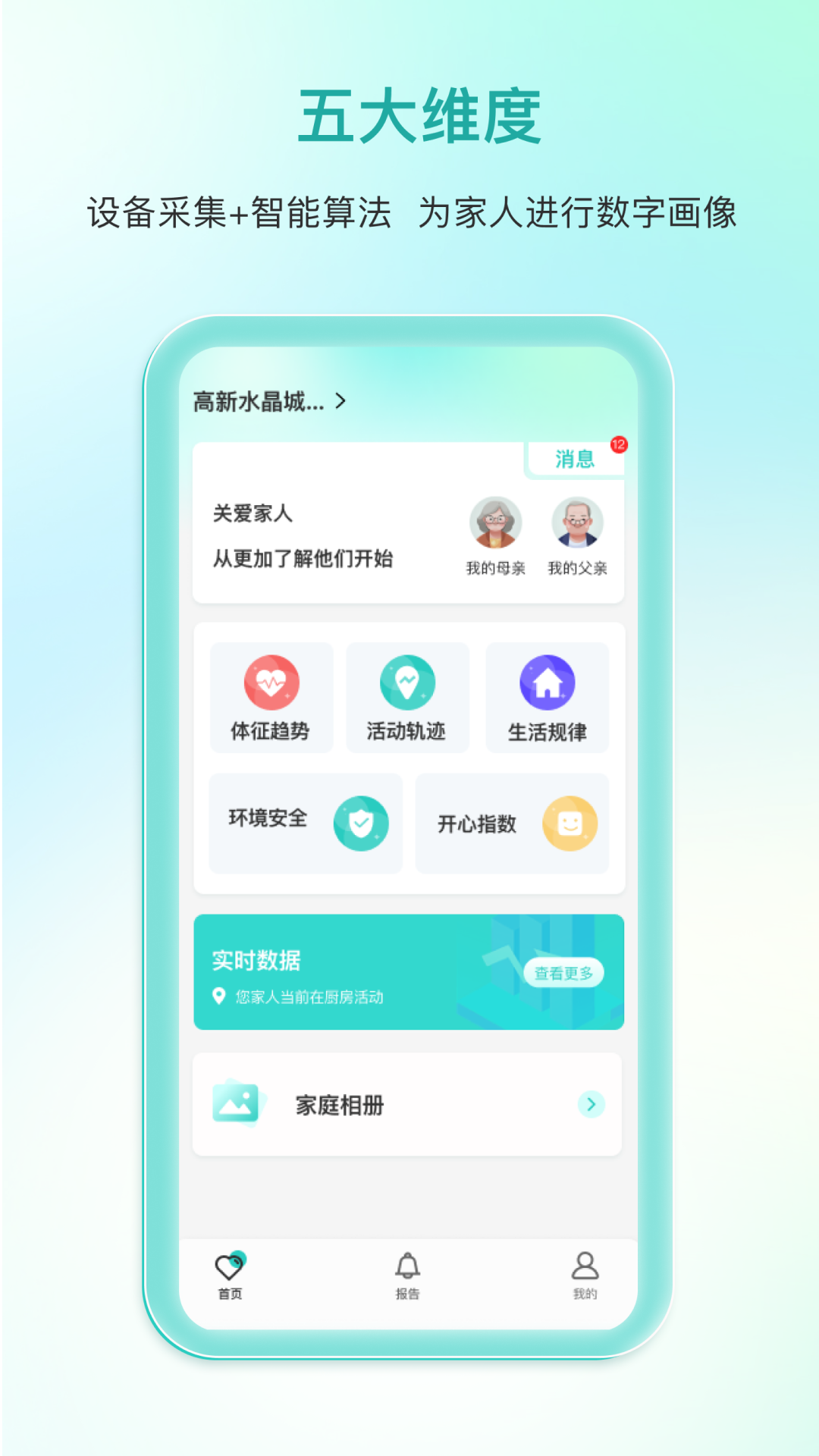 迈恩姆是陕西景特未来健康科技有限公司耗时多年研发而成的一种智能系统,其主要功能是协助看护家人。这个系统融合了“无线网络 + 智能感知 + 云计算”等多项技术,能够对被看护家人在“体征趋势、活动轨迹、生活规律、环境安全、开心指数”这五个维度的信息予以关注。它借助大数据和云计算生成与之相关的趋势报告,使用者可从小程序或者APP查看这些信息。一旦出现异常情况,系统会尽可能地以消息通知看护人,进而帮助看护人以更科学、全面的方式去了解家人,更为贴心、省心地照顾家人。