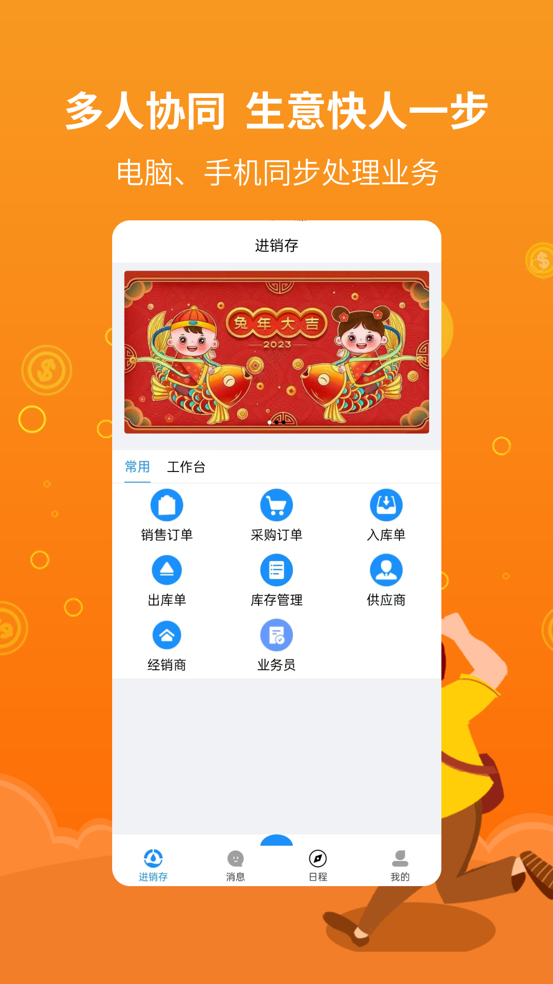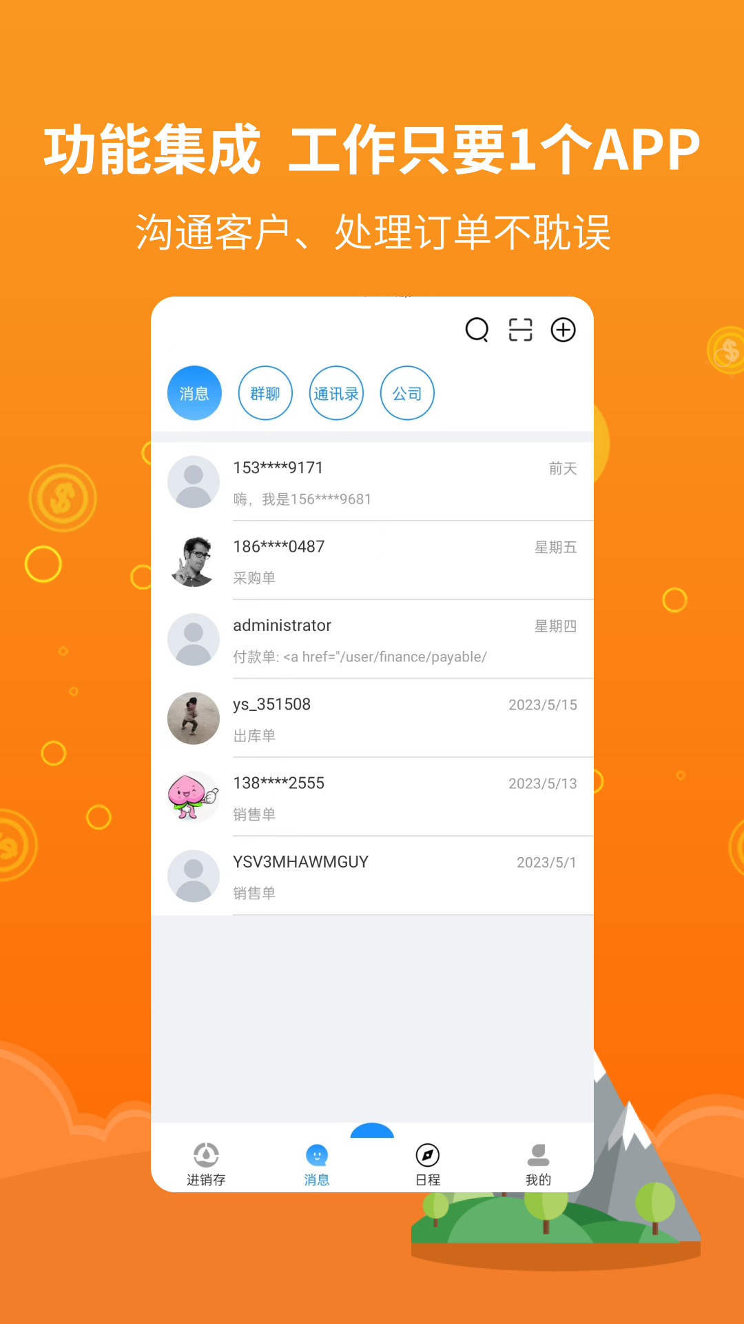 集成即时通讯、日程、在线协同办工、采购、销售、服务、资金、人事等,全面实现企业数据链闭环。