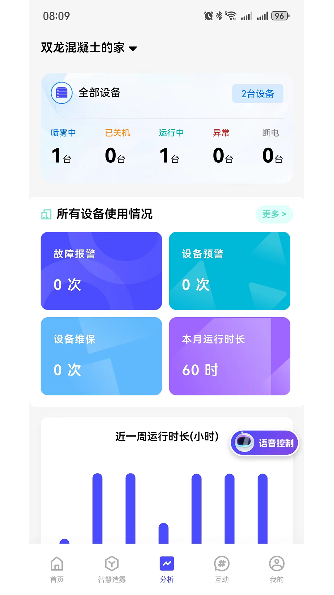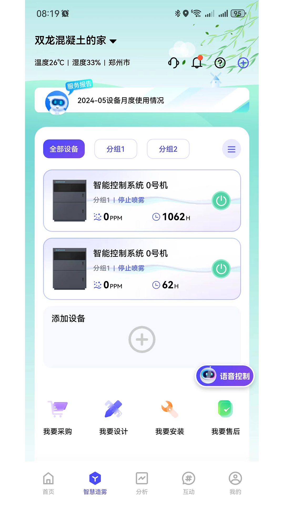 设备控制,可以随时随地操控设备,并且APP具有实时报警功能,当设备出现任何异常情况均会通知用户,方便用户实时监控设备,设备详情页有设备运行数据,设备环境参数(PM2.5、氨气、湿度等)均一目了然,并配备设备一键开关机、一键报修、一键修改时控参数等功能,方便快捷操控设备,让操控设备从此不在繁琐复杂。
