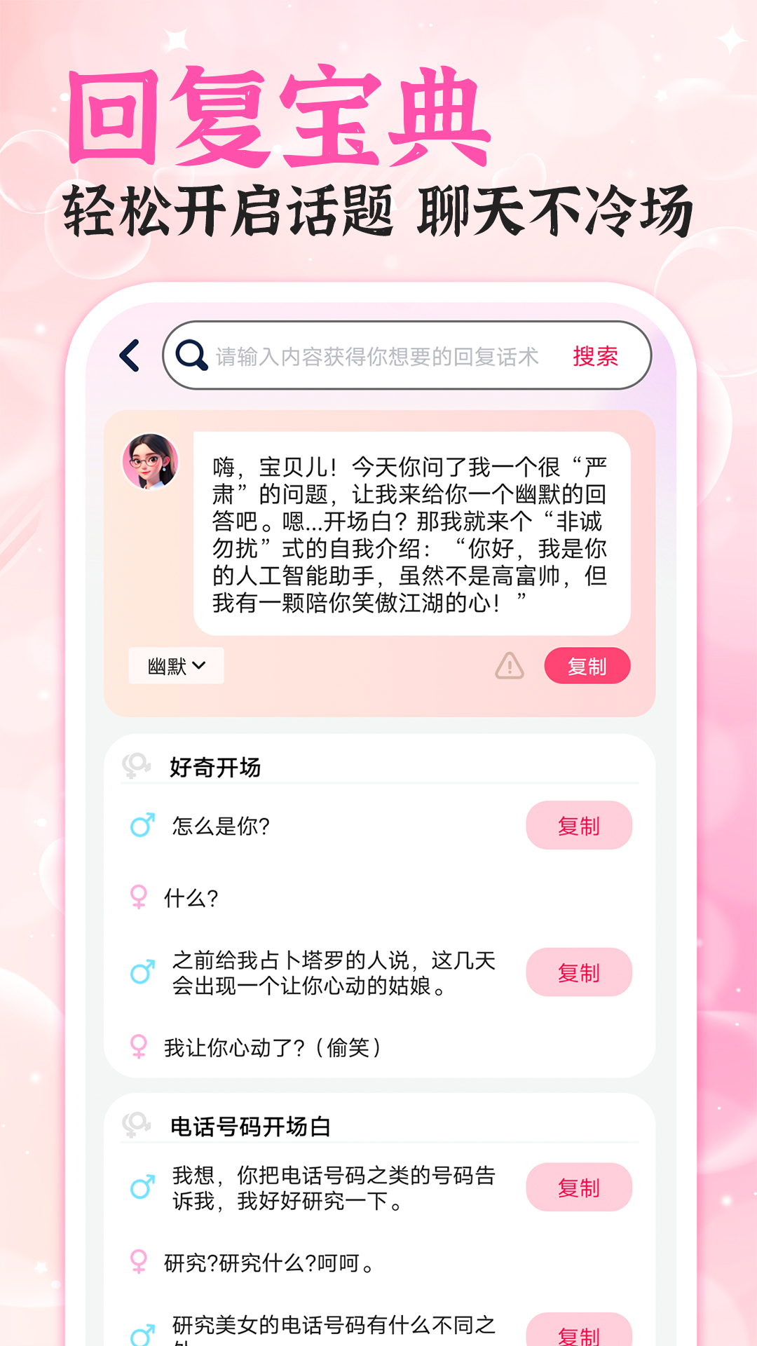 会聊输入法,恋爱聊天话术回复的好帮手。当您处于恋爱的甜蜜互动之中,是否有时会对如何回应感到困惑?会聊输入法中包含丰富的恋爱聊天话术资源,能够及时为您提供有效的回复方案。