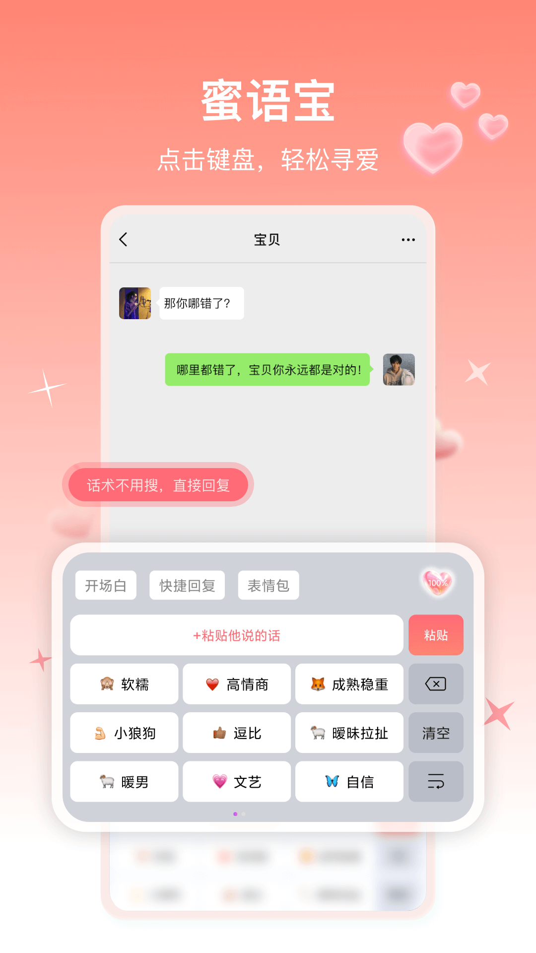蜜语宝是一款专门为帮助人们摆脱尬聊、提升情商而打造的聊天恋爱话术工具。