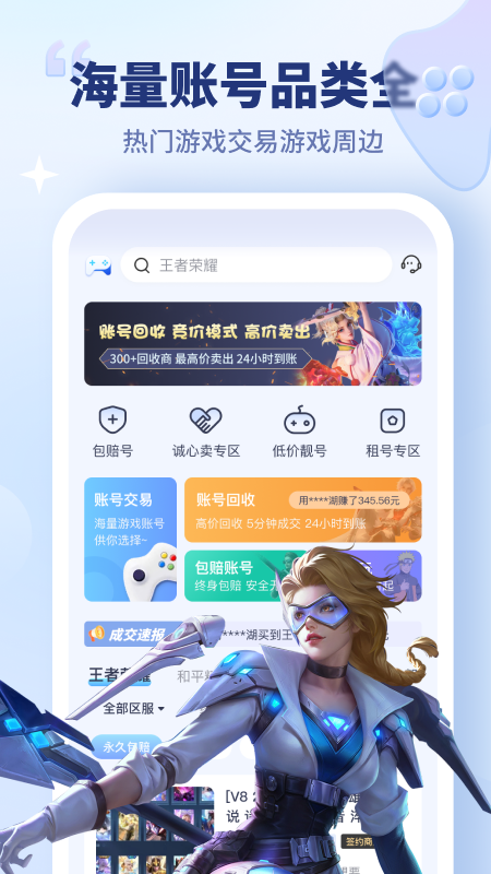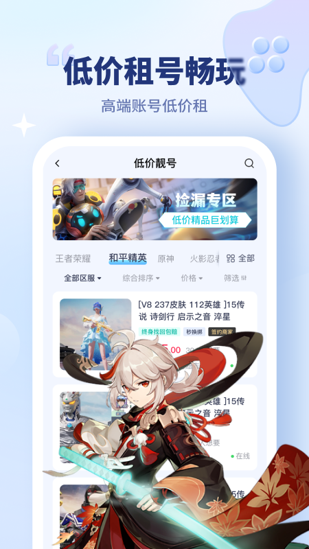 该平台几乎包含了市面上的所有手游交易,汇聚了众多热门游戏的优质账号资源,无论是MMORPG、策略类、射击类,还是竞技类等各种类型的游戏,像《王者荣耀》《和平精英》《元梦之星》《原神》《火影忍者》《枪战王者》《QQ三国》《逆水寒手游》《梦幻西游》等游戏账号都能在这里找到,完全可以满足您的需求。